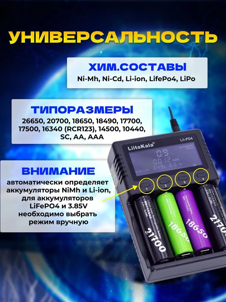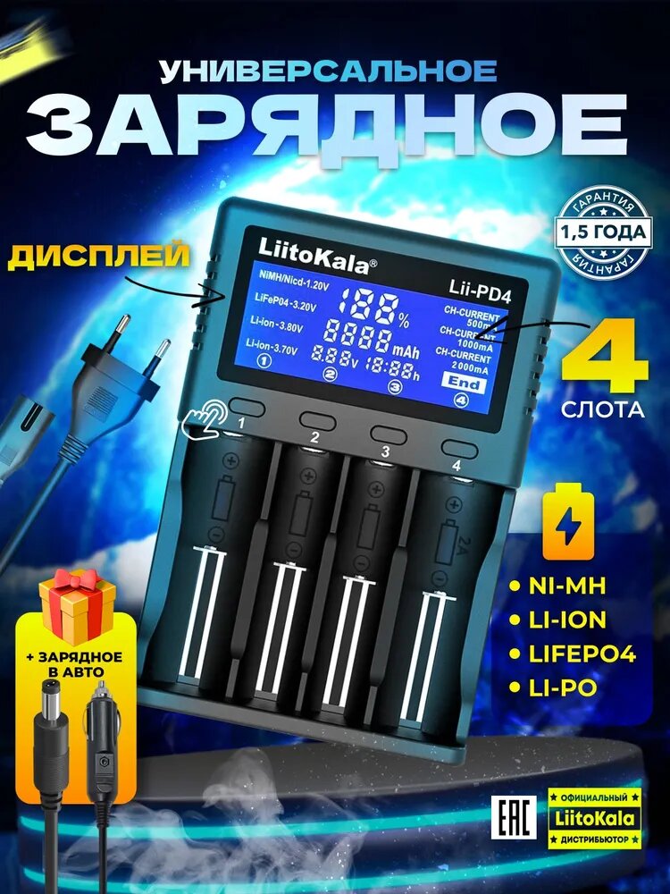 Зарядное устройство для аккумулятора LiitoKala Lii-PD4 Li-ion, Li-Fe, Ni-CD 4 слота с АЗУ в комплекте: сравнение цен, характеристики, фото, актуальное наличие и цены.