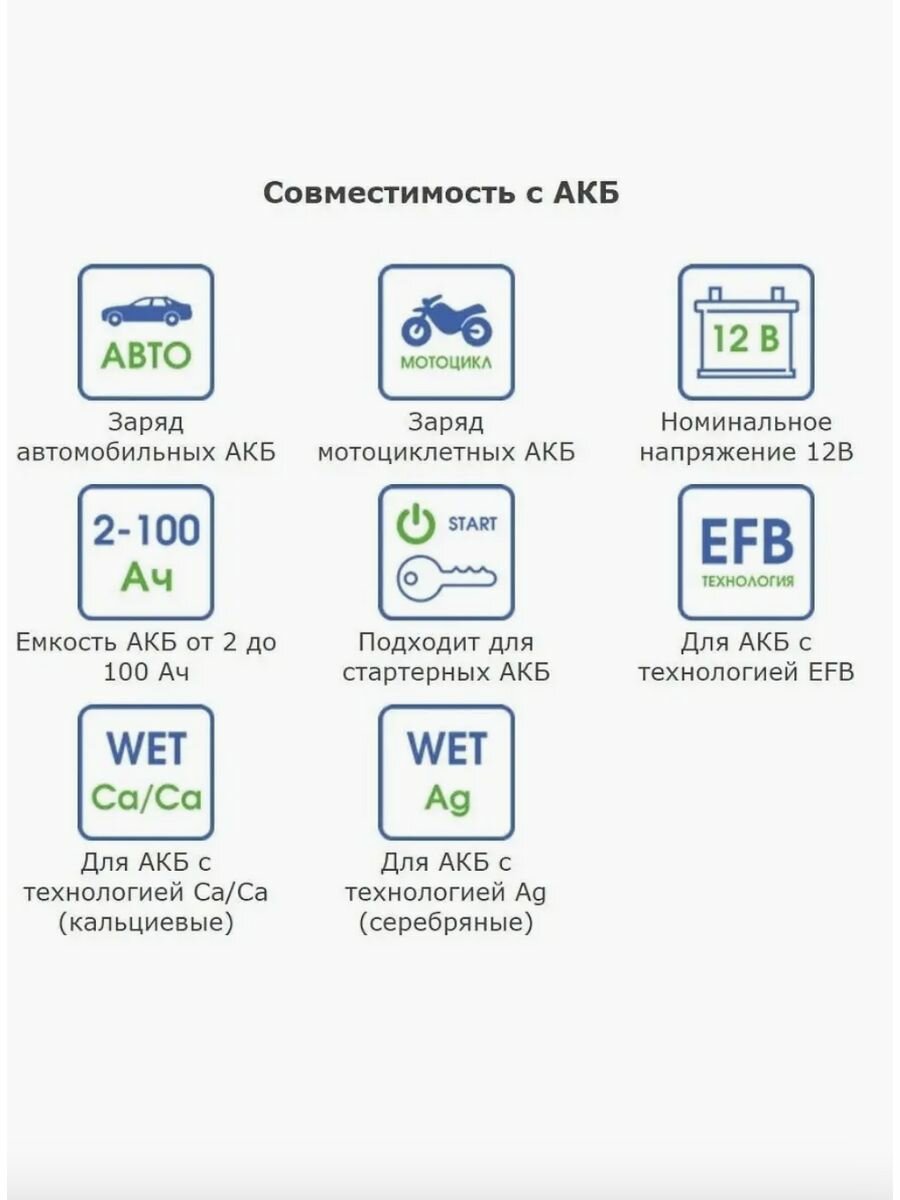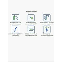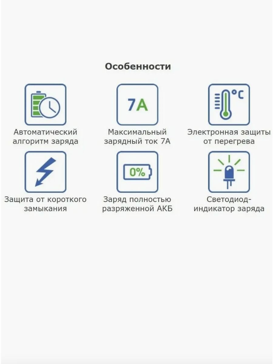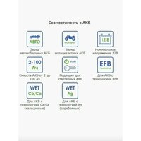 Основные характеристики: Тип заряжаемых АКБ: EFB, WET Ag (серебряные), WET Сa/Ca (кальциевые). Номинальное напр. АКБ, В: 12. Максимальная ёмкость аккумулятора, А*ч : 100. Максимальный зарядный ток, А: 7. Регулировка тока: нет. Регулировка напряжения: нет. Индикатор: светодиод.