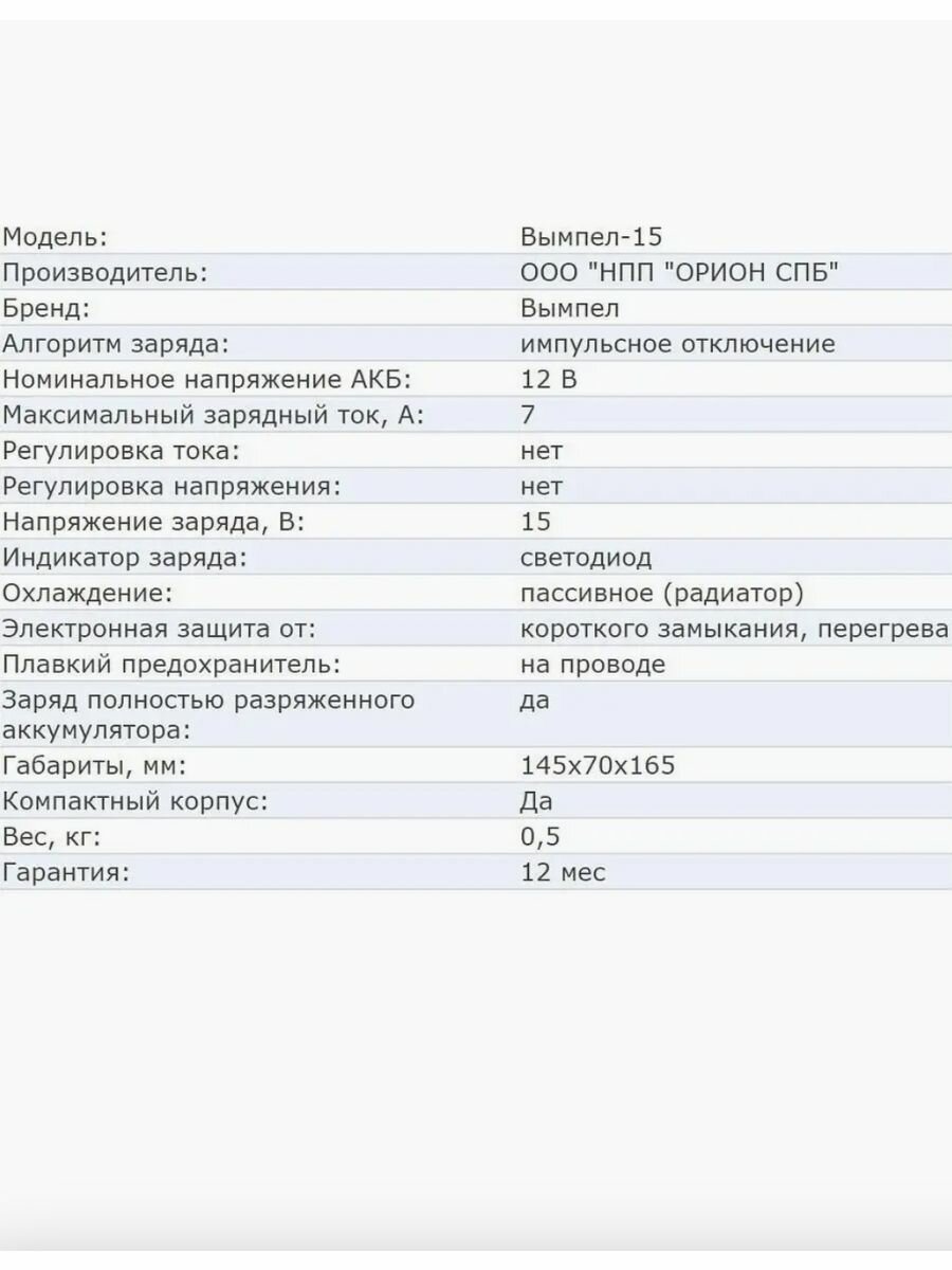 Зарядное устройство для аккумулятора Вымпел 15, 7А-12В от ООО "НПП "орион" - это надежное решение для поддержания оптимального состояния аккумуляторных батарей вашего автомобиля. Специально разработанное для использования с аккумуляторами емкостью до 100 А*ч, это зарядное устройство обеспечивает эффективную и безопасную зарядку.
