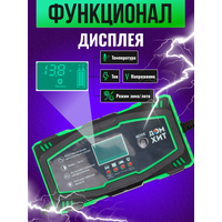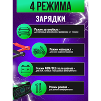 автоматическое отключение зарядки, встроенный амперметр, встроенный вольтметр, подходит для AGM/GEL аккумуляторов, режим зимней зарядки