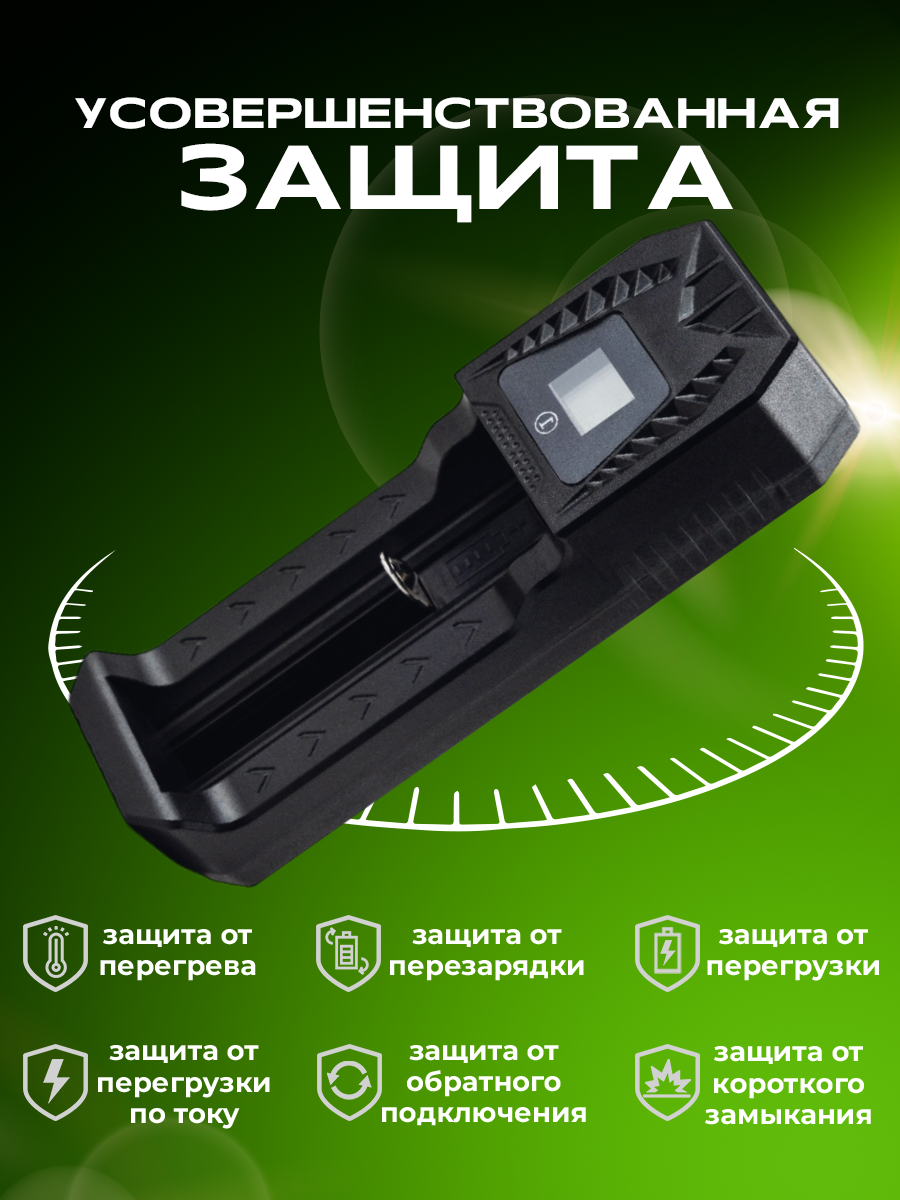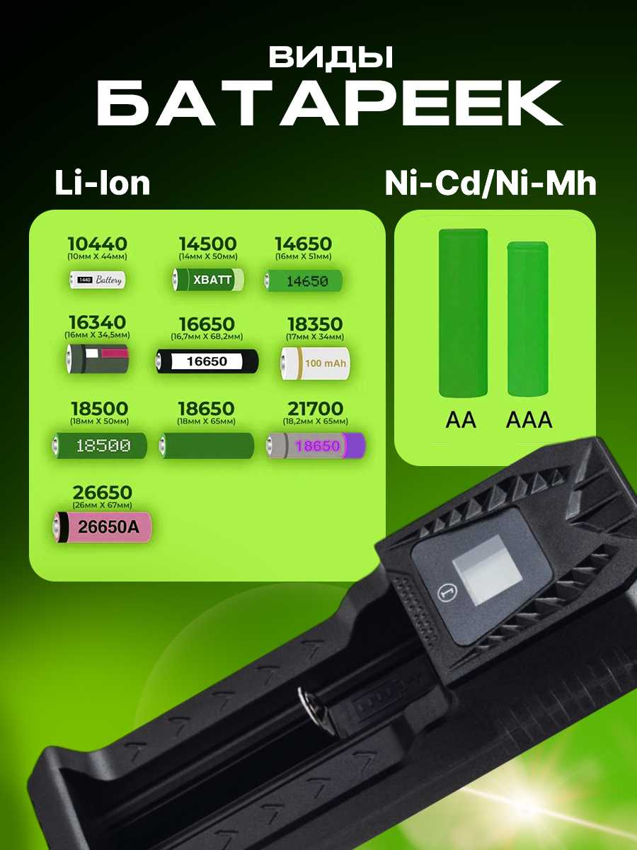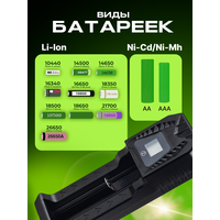 | Типоразмер аккумулятора | 1/2AA, 1/2AAA, 10440, 14500, 14650, 16340, 16650, 18350, 18500, 18650, 21700, 26650, 32650, AA, AA+AAA, AAA |