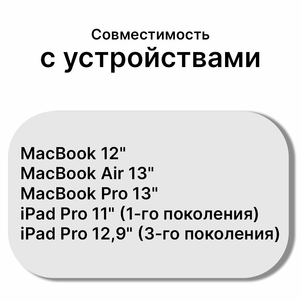 Зарядное устройство совместимо с MacBook Pro 13 2016 года и выше, MacBook Air от 2018 года, MacBook 12 2015 - 2017, а также подходит для iPad 11 и iPad 12,9 и AirPods, что делает его универсальным решением для множества устройств. Блок питания идет в комплекте с вилкой, подходящей под европейские розетки, что исключает необходимость дополнительных адаптеров.