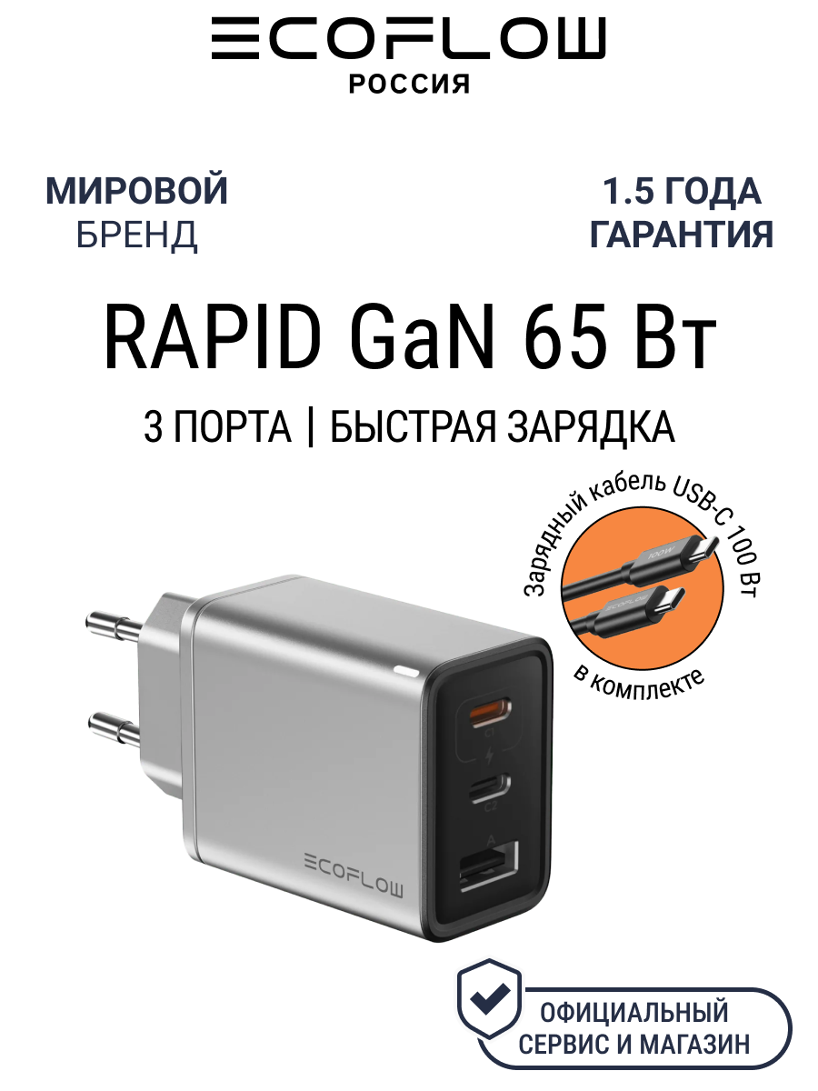 Купить Зарядное устройство EcoFlow RAPID GaN 65 Вт с кабелем 100 Вт с доставкой по всей России. Зарядное устройство EcoFlow RAPID GaN 65 Вт с кабелем 100 Вт: сравнение цен, характеристики, фото, актуальное наличие и цены.