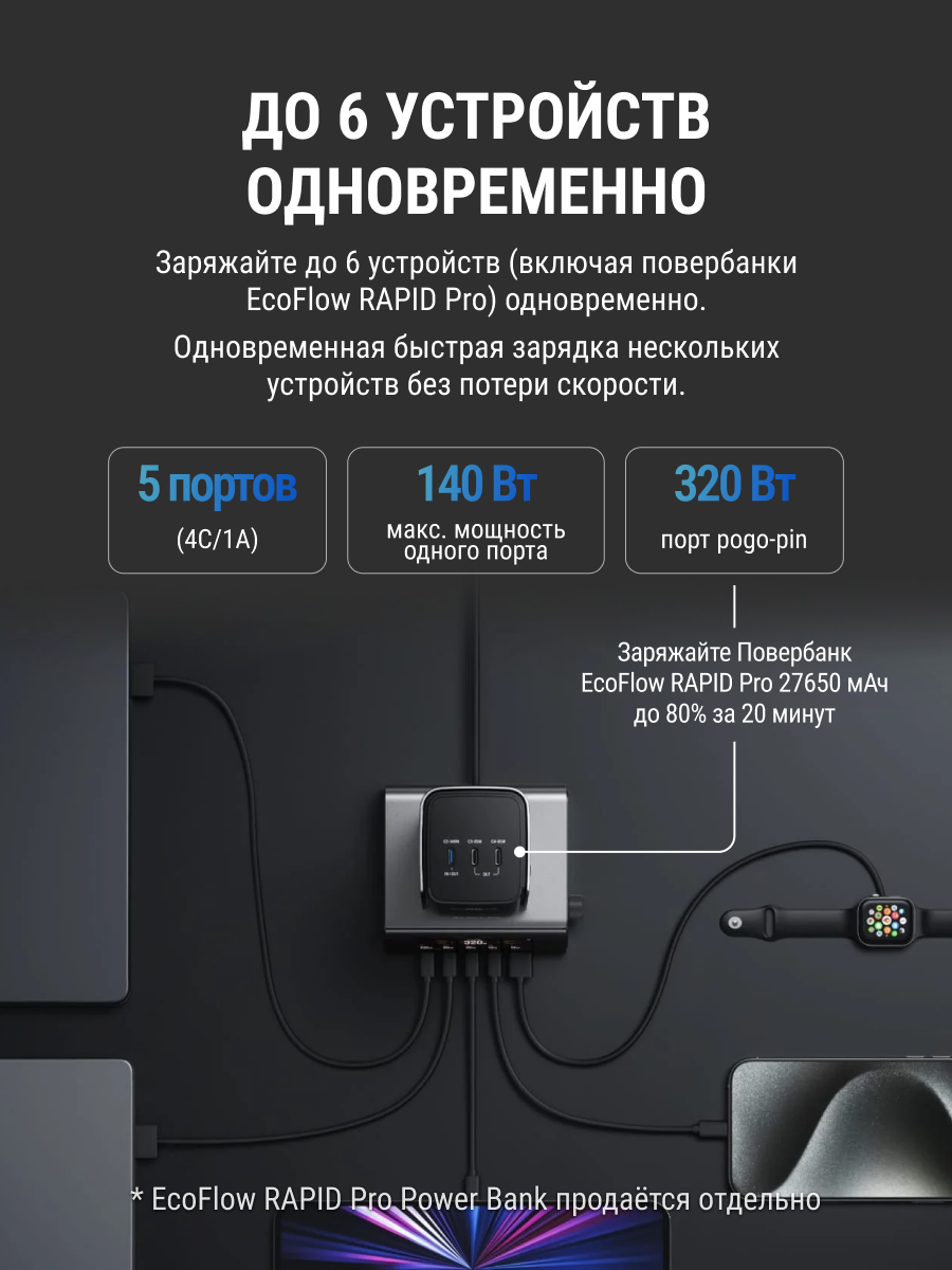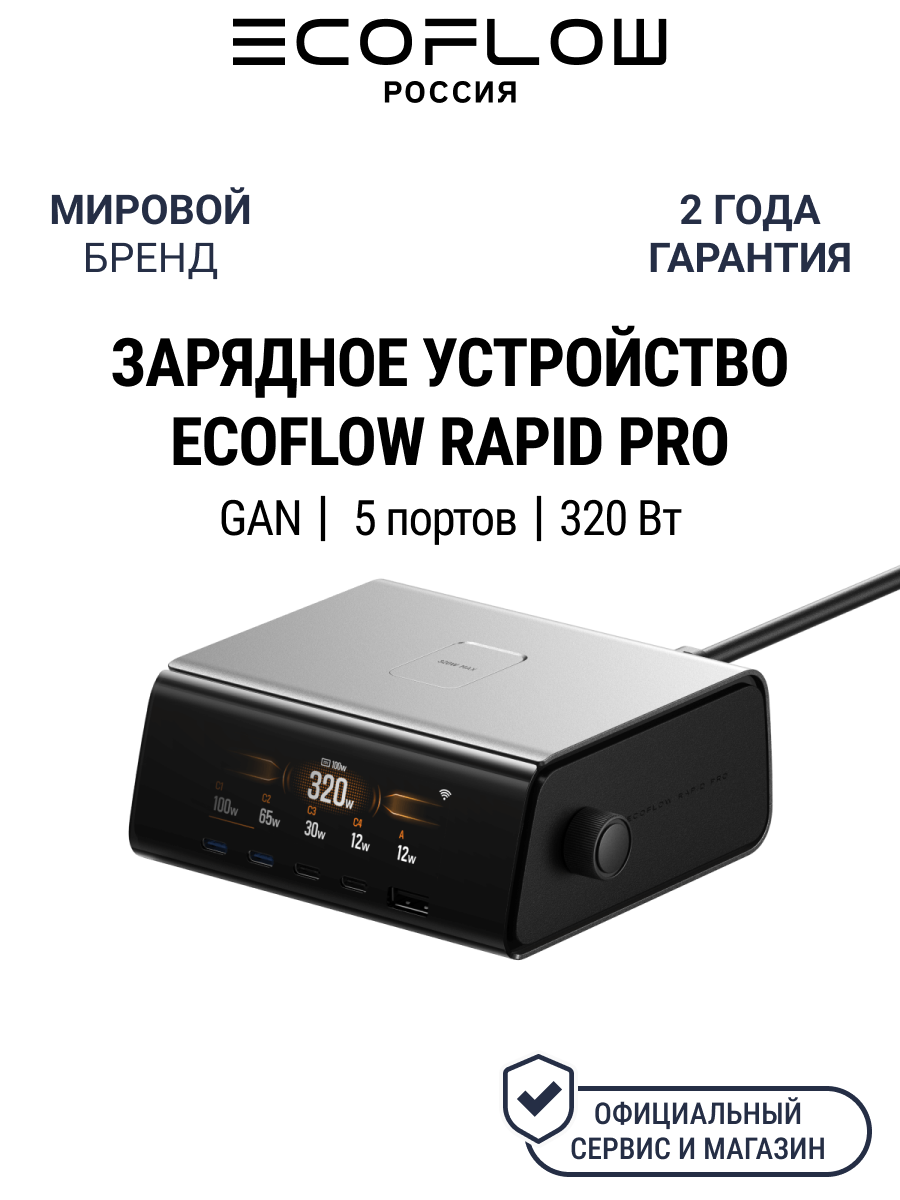 Купить Зарядное устройство EcoFlow RAPID Pro (320 Вт, 5 портов, GaN) с доставкой по всей России. Зарядное устройство EcoFlow RAPID Pro (320 Вт, 5 портов, GaN): сравнение цен, характеристики, фото, актуальное наличие и цены.