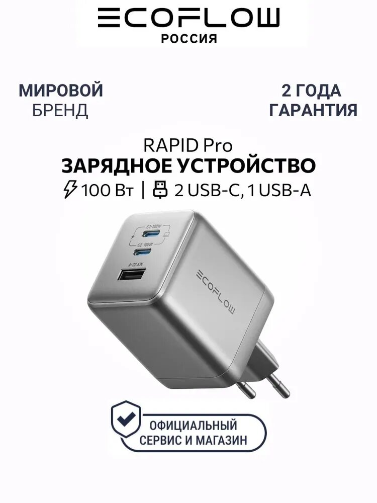 Купить Зарядное устройство EcoFlow RAPID Pro, GaN, 100Вт, 3порта, серебристое с доставкой по всей России. Зарядное устройство EcoFlow RAPID Pro, GaN, 100Вт, 3порта, серебристое: сравнение цен, характеристики, фото, актуальное наличие и цены.