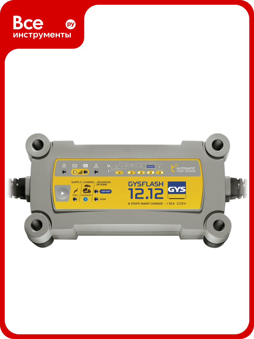 GYSFLASH 12.12 разработан для зарядки или автоматической подпитки свинцовых АКБ 12В с жидким или гелевым электролитом. Высококачественный, компактный, легкий и герметичный.