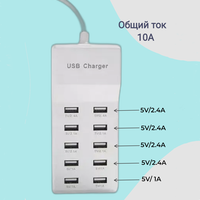 Устройство оснащено 10 USB-портами, что позволяет одновременно заряжать до 10 устройств. Максимальный ток зарядной станции составляет 10А. Зарядное устройство не поддерживает функцию быстрой зарядки QC и PD.