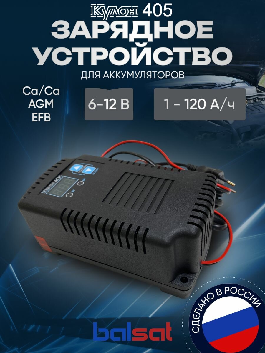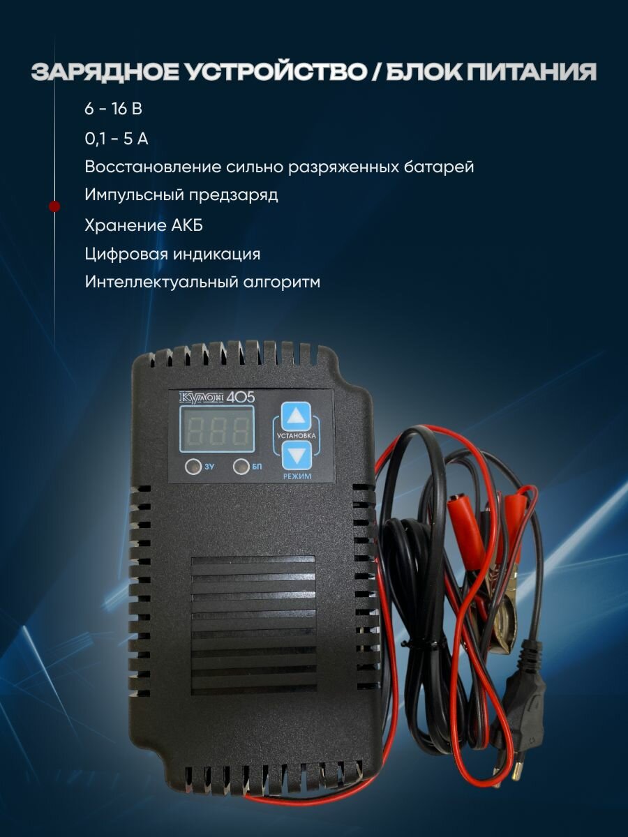 Кулон 405 имеет цифровой светодиодный индикатор, на котором отображается зарядный ток и напряжение, имеется возможность регулировки зарядного тока и максимального напряжения. Зарядные устройства серии Кулон 405 так же можно использовать в качестве регулируемого блока питания 6 - 14 В. Алгоритм работы зарядных устройств этой серии реализует комбинированный метод заряда аккумуляторной батареи, не допуская опасного для батареи перенапряжения, приводящего к кипению электролита. Электронная схема защиты обеспечивает безопасность при коротких замыканиях и перегреве. При не правильном подключении прибор защищен легкодоступным стандартным автомобильным предохранителем. Зарядное устройство рассчитано на эксплуатацию в условиях умеренного климата в широком диапазоне температур окружающей среды от - 25 С° до + 40 С° и относительной влажности до 98% при + 25 С°.