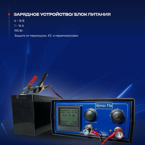 Зарядное устройство с цифровой индикацией параметров заряда — тока и напряжения. Прибор имеет ручную регулировку максимального зарядного тока и напряжения ограничения. Может использоваться в режиме регулируемого блока питания с напряжением от 6,0В до 16,0В для низковольтного электронного и электрооборудования с параметрами электропитания, соответствующими нижеуказанным техническим данным. Максимальный ток заряда 16A.