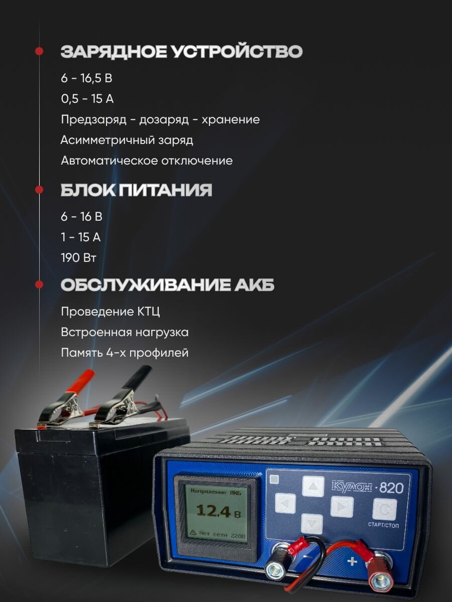 Зарядные устройства серии Кулон - 820 предназначены для: Заряда и восстановления аккумуляторных батарей, применяемых на автомобилях, катерах, мотоциклах, и т. д. Приборы имеют дополнительный режим работы - блок питания. Кулон 820 имеет цифровой жидкокристаллический индикатор, на котором отображается зарядный ток и напряжение, имеется возможность ручной регулировки зарядного тока и максимального напряжения. Зарядное устройство серии Кулон так же можно использовать в качестве регулируемого блока питания. Алгоритм работы обеспечивает корректный режим заряда и восстановления даже очень сильно разряженных батарей, а так же безопасное долговременное хранение в режиме поддержания заряда, не допуская опасного для батареи перенапряжения, приводящего к кипению электролита. Зарядное устройство имеет электронную схему защиты от аварийных ситуаций. Зарядное устройство рассчитано на эксплуатацию в условиях умеренного климата в широком диапазоне температур окружающей среды от - 20 °С до + 40 °С и относительной влажности до 98% при + 25 °С.