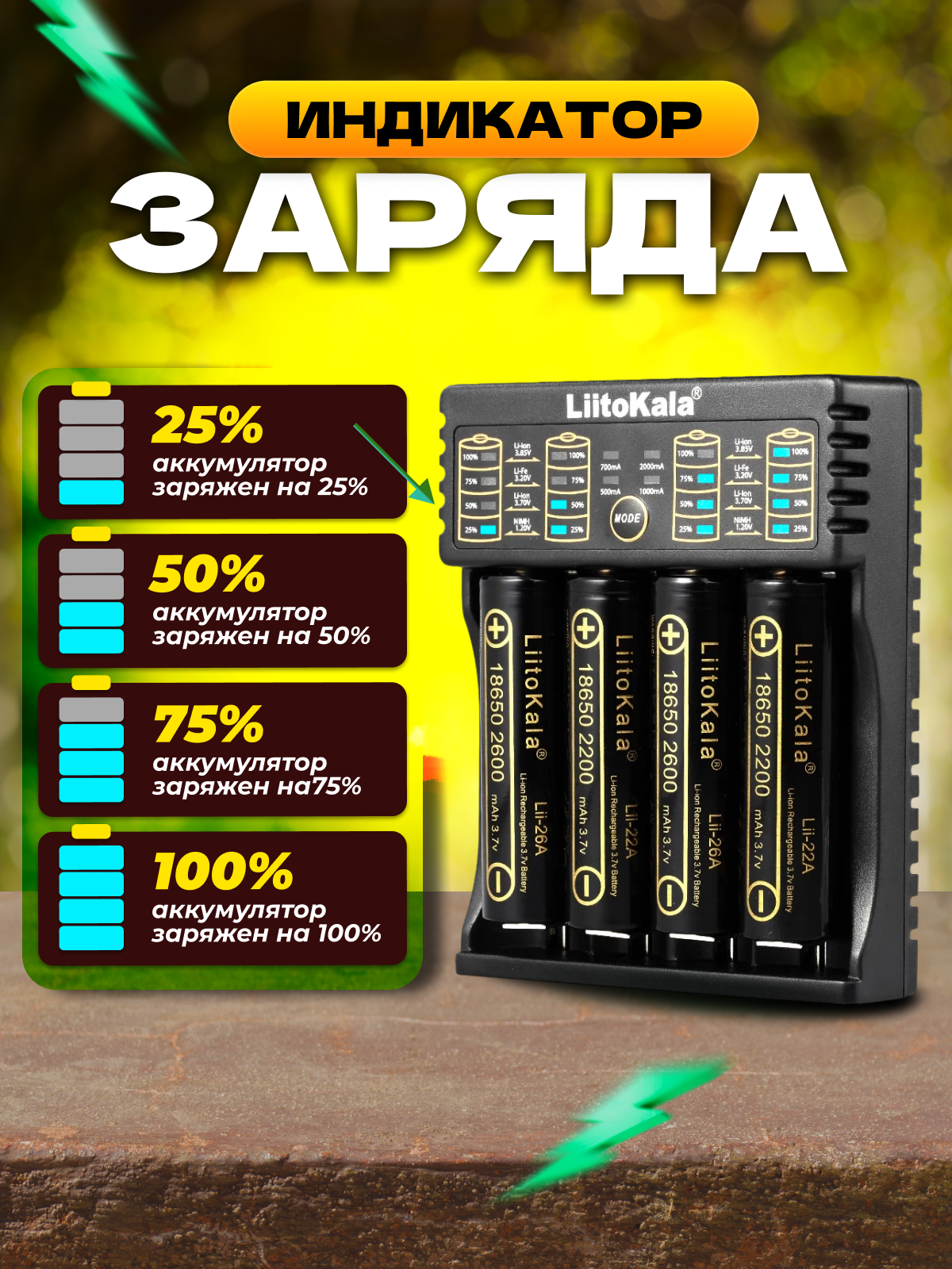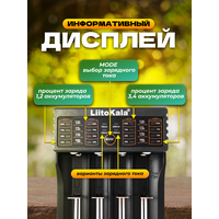 | Типоразмер аккумулятора | 10340, 10350, 10440, 10500, 12340, 12500, 12650, 13450, 13500, 13650, 14350, 14430, 14500, 14650, 16340, 16500, 16650, 17335, 17350, 17500, 17650, 17670, 18350, 18490, 18500, 18650, 18700, 2/3A, 2/3AA, 2/3AAA, 20700, 21700, 22500, 22650, 25500, 26350, 26500, 26650, A, AA, AA+AAA, AAA, C, CR123, SC |