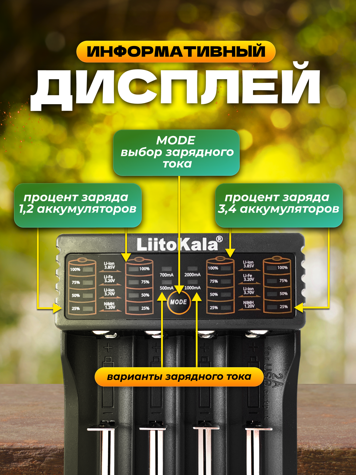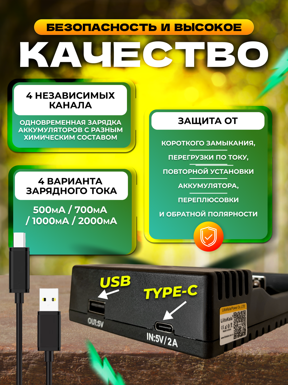 | Особенности | USB-выход, быстрая зарядка, восстановление емкости, встроенный дисплей, защита от короткого замыкания, защита от перегрева, защита от переполюсовки, измерение емкости, подвижный контакт, предохранитель, разряд аккумулятора перед зарядкой |