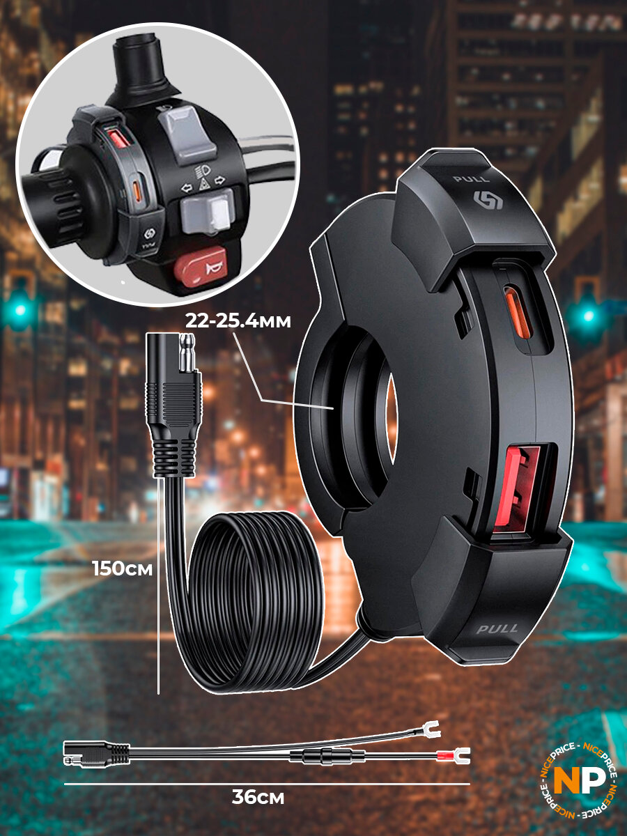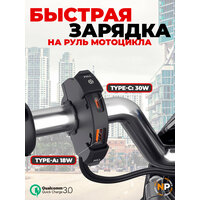 Незаменимое высококачественное зарядное устройство на руль мотоцикла. Обладает высокой надежностью и водонепроницаемостью. Имеет USB-порт с двумя портами 18 Вт. Защита от пониженного напряжения и короткого замыкания делает зарядное устройство безопасным для использования на открытом пространстве. Предназначено для питания большинства автомобильных принадлежностей, таких как мобильные телефоны, планшеты, навигация и GPS. Зарядное устройство имеет возможность подключения к источнику питания 12v – 24v и подходит для большинства рулей мотоциклов. Характеристики: Название: зарядное устройство на руль мотоцикла Материал: Nylon Входное напряжение: DC12V-24V Выходной ток: USB: 5v-3. 4A; 9V-2A; 12v-1. 5a TYPE-C: 5V-3A; 9V-3A; 12v-2. 5a Выходная мощность: USB: 18 W TYPE-C: 30 W Габариты упаковки : длина 17см, ширина 11см, высота 4см Вес с упаковкой 120гр. Способ установки: установка на руль мотоцикла Установочный диаметр: 22мм/25.4мм Комплектация : Зарядное устройство с крепежным устройством на руль Шестигранный ключ Противоскользящая прокладка Запасной предохранитель Удлинитель проводки