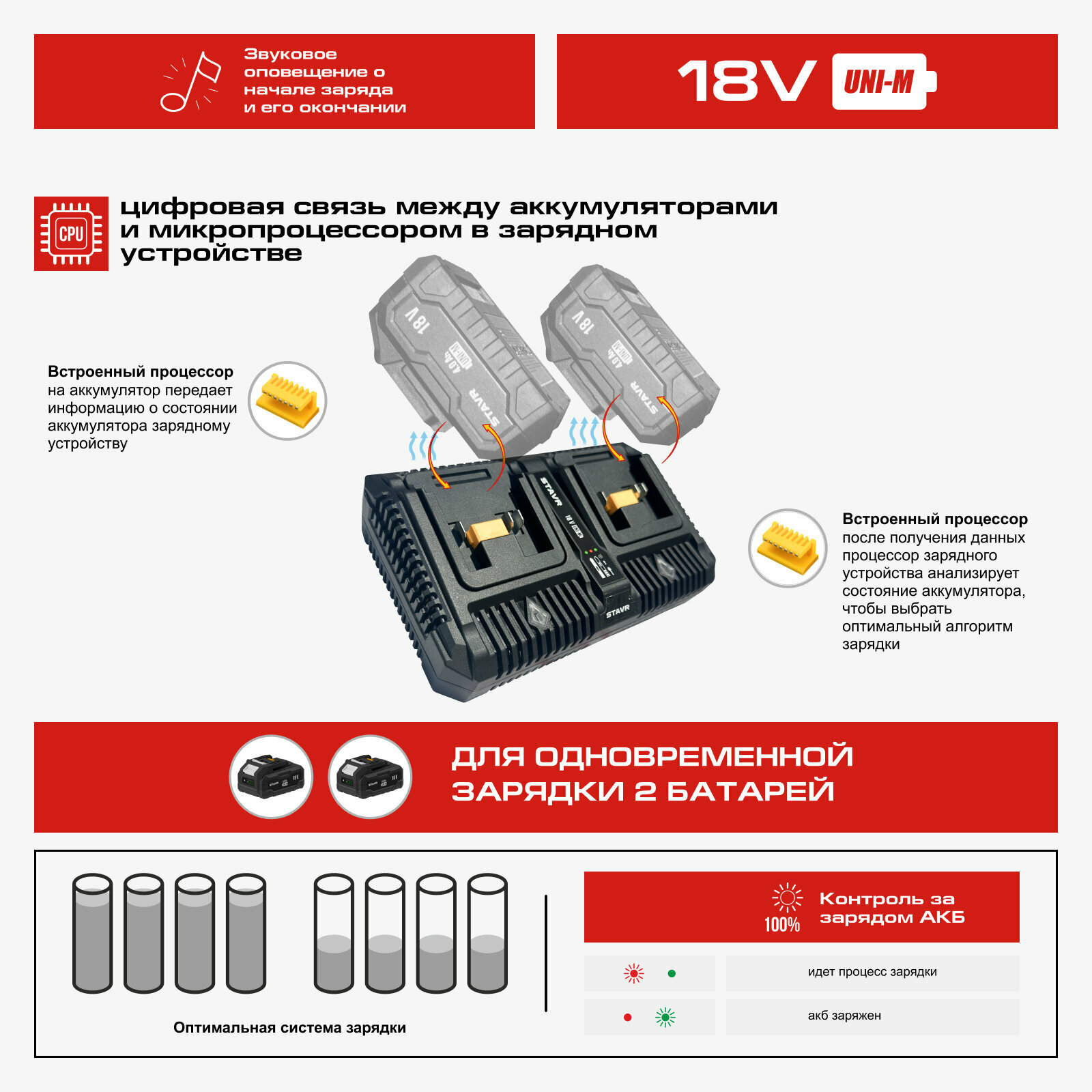 Зарядное устройство STAVR SBC 18-6A2-01 оснащено двумя портами по 3А каждый, что позволяет одновременно заряжать два аккумулятора. Это особенно удобно, если вам нужно зарядить сразу несколько аккумуляторов или инструментов.