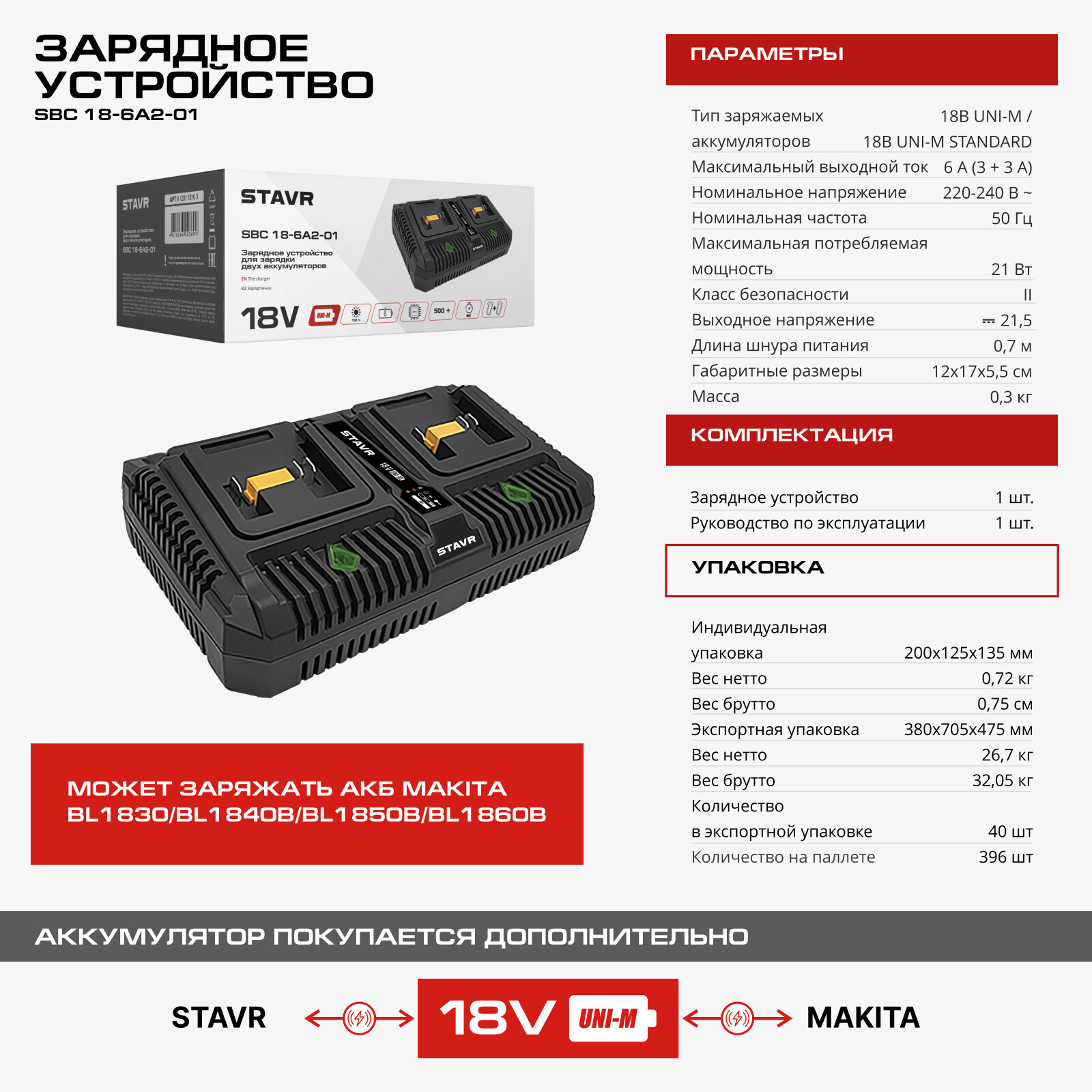 Купить Зарядное устройство STAVR SBC 18-6A2-01, 18V UNI-M, 6А (2 порта по 3А) с доставкой по всей России. Зарядное устройство STAVR SBC 18-6A2-01, 18V UNI-M, 6А (2 порта по 3А): сравнение цен, характеристики, фото, актуальное наличие и цены.