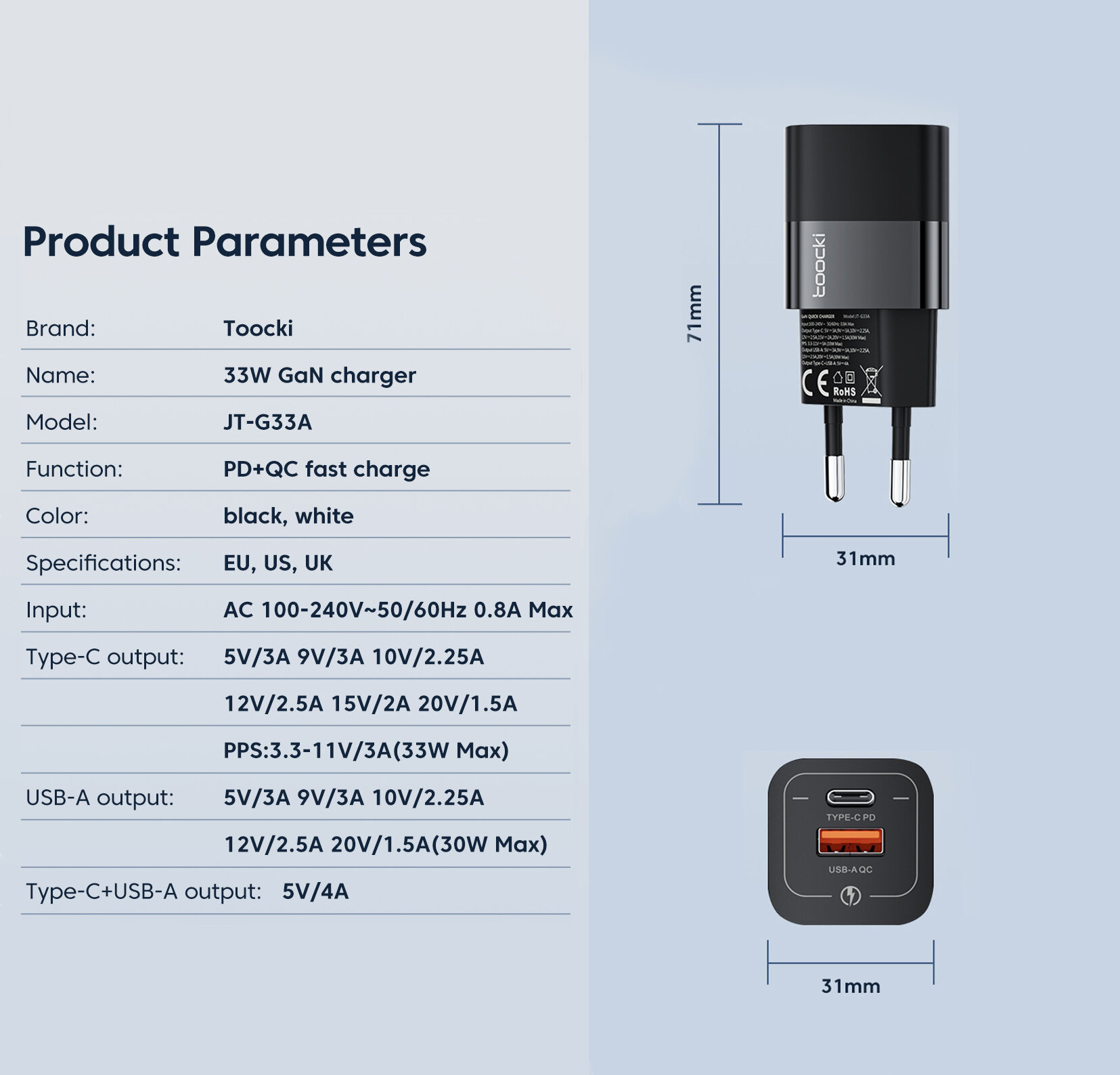 | Дополнительная информация | Gan Входное напряжение 12 В/2.5A, 5V/3A, 9V/3A, 15V/2A, 20V/1.5A, 10V/2.25A, 11V/3A(33W Max) Выходное напряжение 5 В/3A, 9V/3A, 10V/2.25A, 12V/2.5A, 20V/1.5A(30W Max) Мощность на выходе 33W |