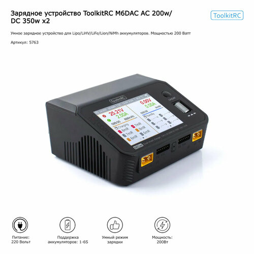M6DAC от ToolkitRC — интеллектуальное зарядное устройство с двумя каналами для зарядки аккумуляторов LiPo 1-6S, а также LiHV, LiFe, Lion, NiMh и Pb. Оснащено встроенным блоком питания мощностью 200 Вт для подключения к сети 220 В.