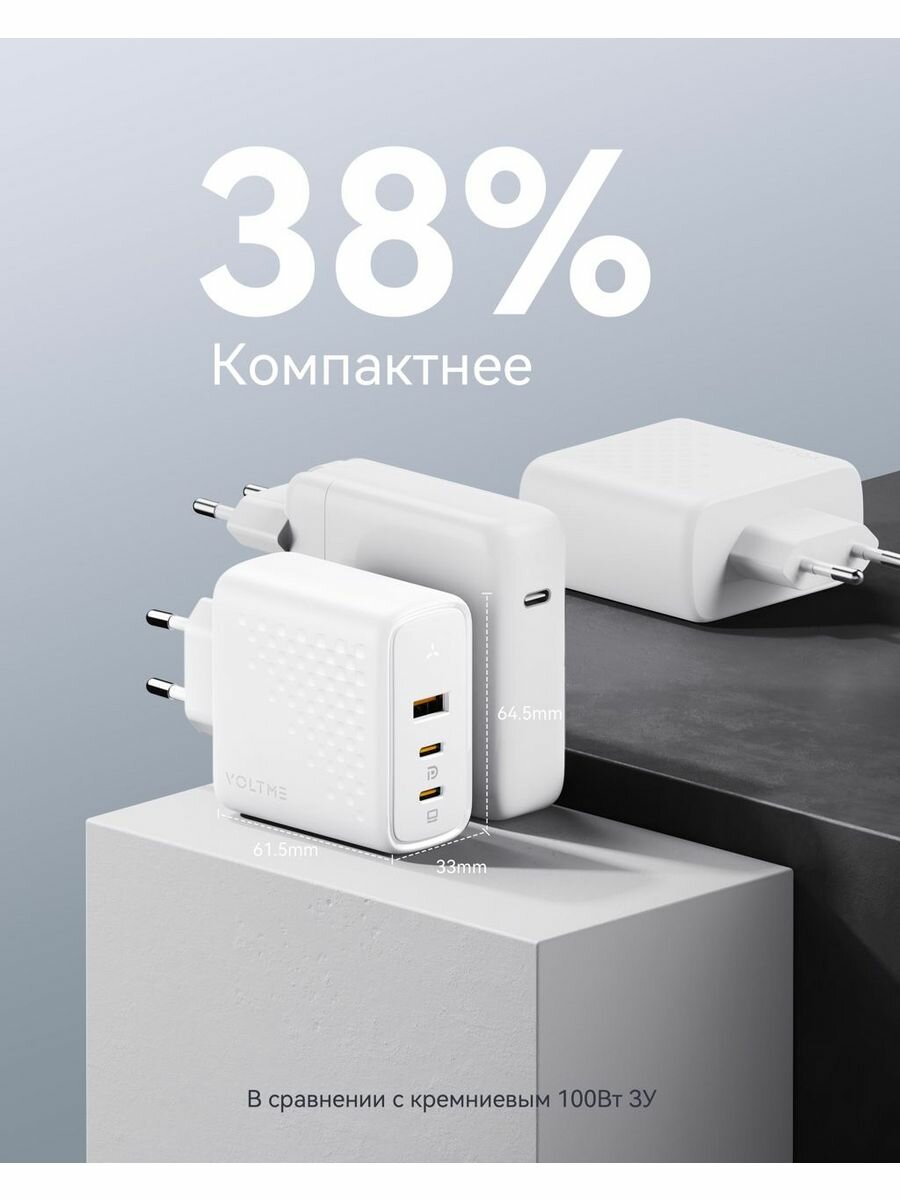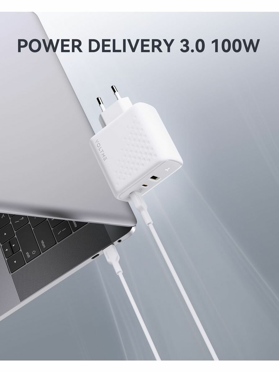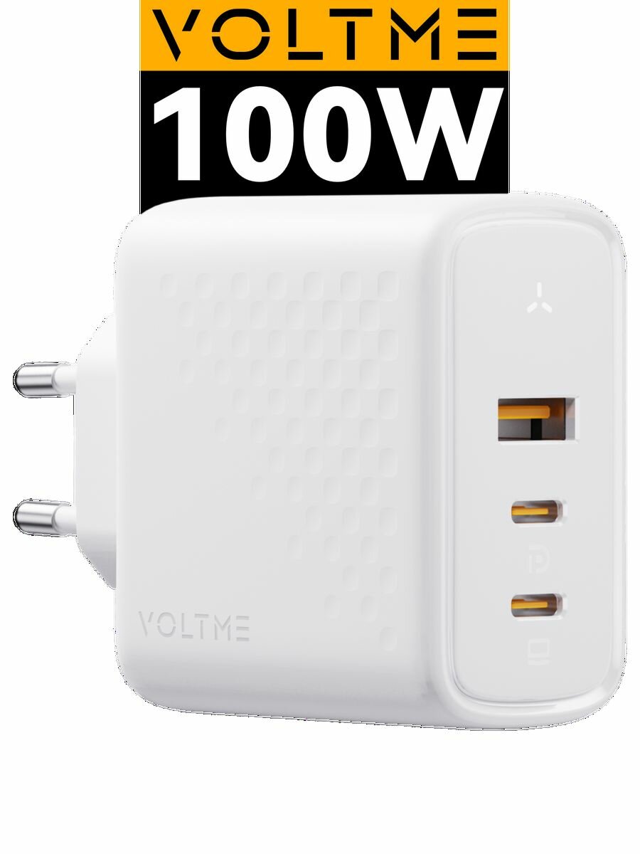 VOLTME Revo 100 CCA GaN Hi-Tech – универсальное мощное зарядное устройство премиум качества для смартфонов, мобильных телефонов, планшетов, ноутбуков и других умных электронных устройств с портом тайп си. На 38% компактнее стандартного 96W ЗУ благодаря производству по технологии GaN 3 поколения.