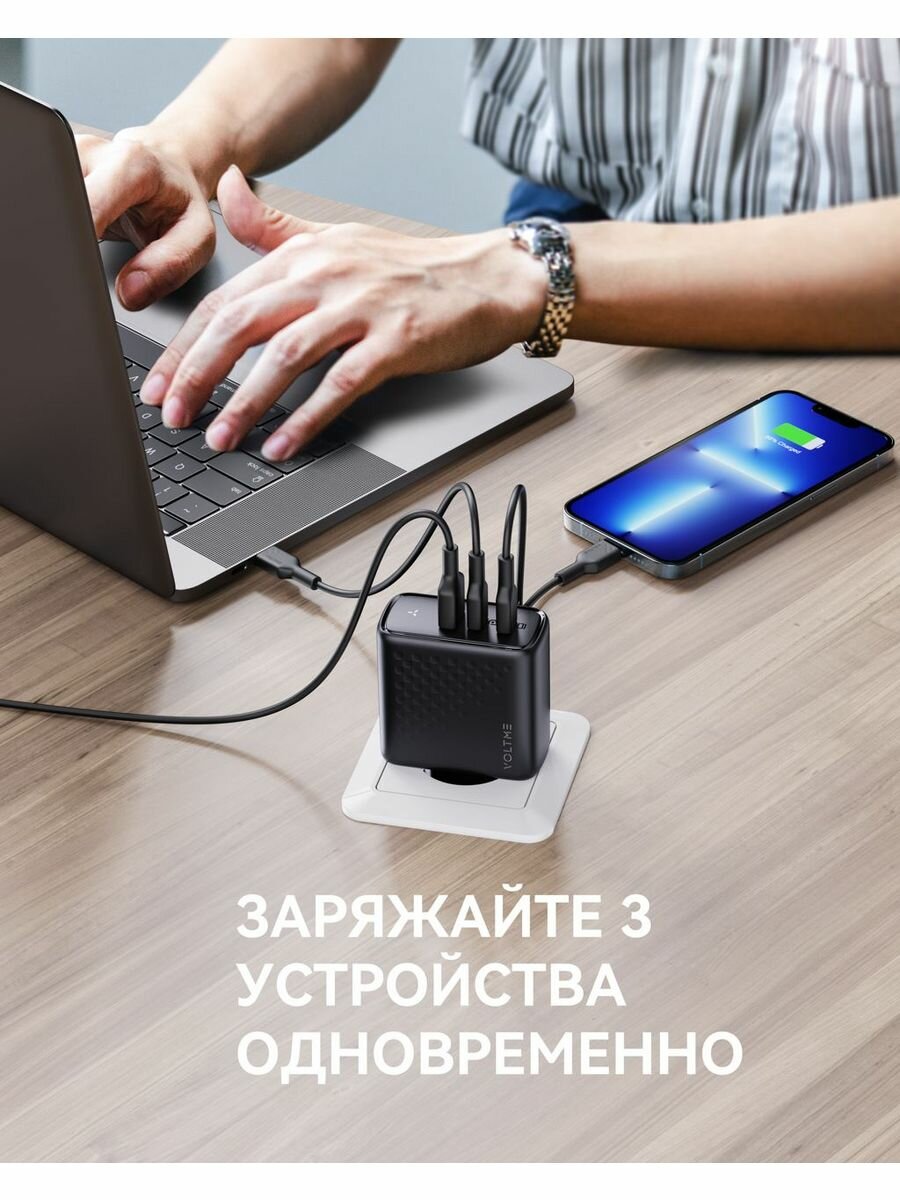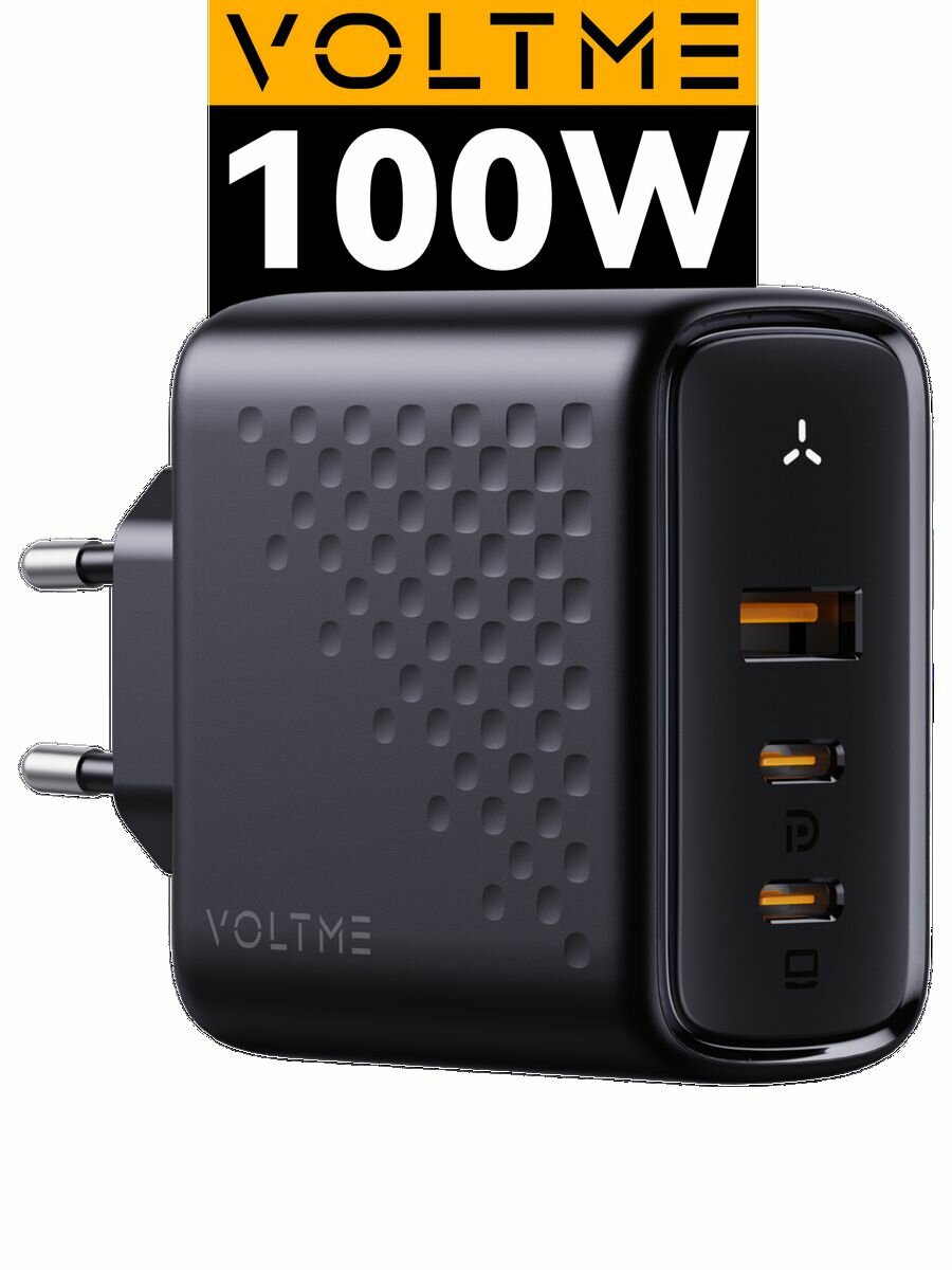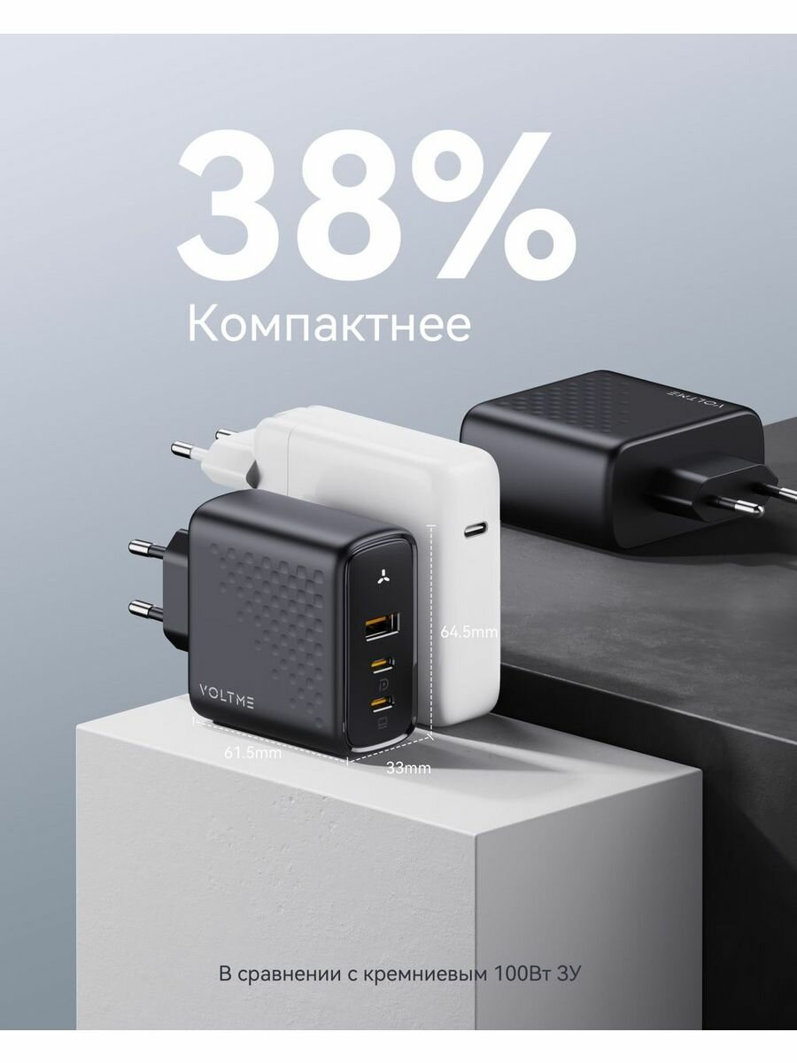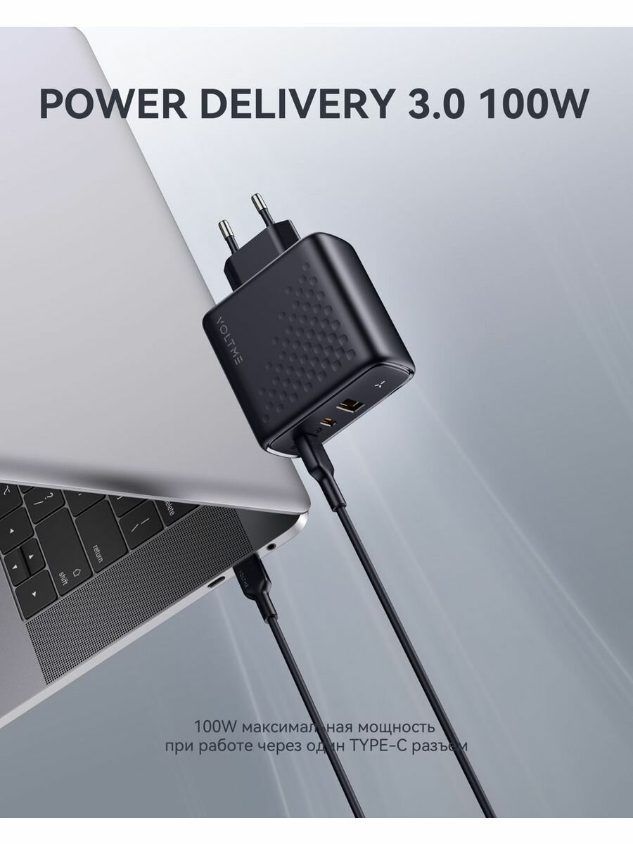 VOLTME Revo 100 CCA GaN Hi-Tech – универсальное мощное зарядное устройство премиум качества для смартфонов, мобильных телефонов, планшетов, ноутбуков и других умных электронных устройств с портом тайп си. На 38% компактнее стандартного 96W ЗУ благодаря производству по технологии GaN 3 поколения.