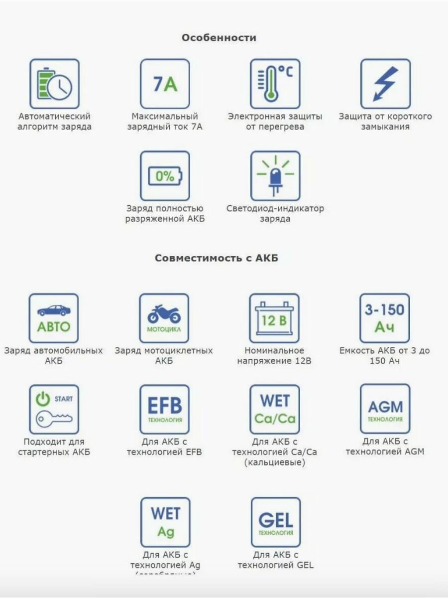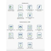 Основные характеристики: Тип заряжаемых АКБ: AGM, EFB, GEL, WET Ag (серебряные), WET Sb (сурьмянистые), WET Сa/Ca (кальциевые), WET Сa/Sb (гибридные). Номинальное напр. АКБ, В: 12. Максимальная ёмкость аккумулятора, А*ч : 150. Максимальный зарядный ток, А: 7. Регулировка тока: нет. Регулировка напряжения: нет. Индикатор: светодиод.