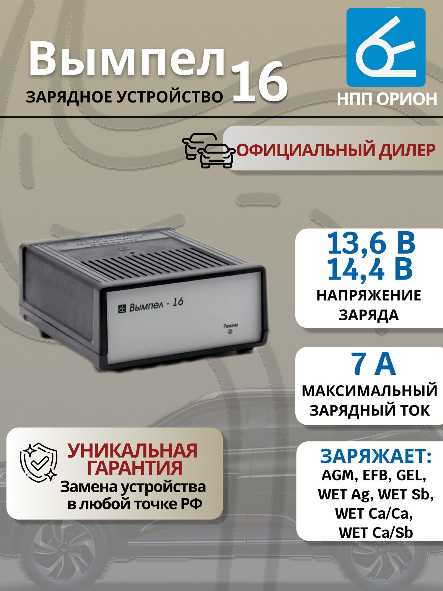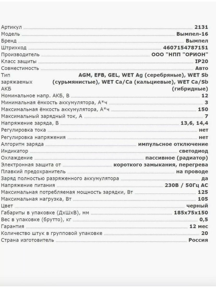 Зарядное устройство для аккумулятора Вымпел 16, 7А-12В от ООО "НПП "орион" - это надежное решение для поддержания оптимального состояния аккумуляторных батарей вашего автомобиля. Специально разработанное для использования с аккумуляторами емкостью до 150 А*ч, это зарядное устройство обеспечивает эффективную и безопасную зарядку.