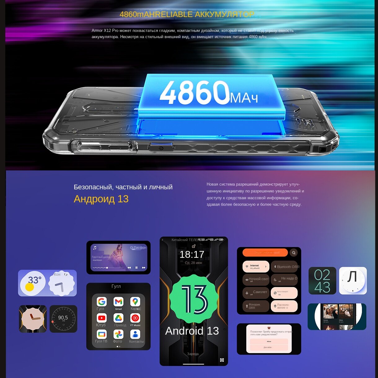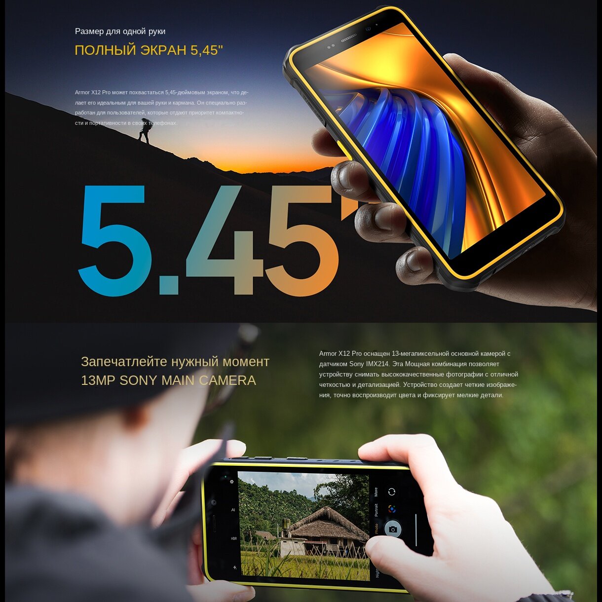 Купить Защищённый смартфон Ulefone Armor X12 Pro, Android 13, 8 ГБ ОЗУ + 64 ГБ, 4860 мАч, 13 МП, 5,45 дюйма, NFC, 4G с доставкой по всей России.