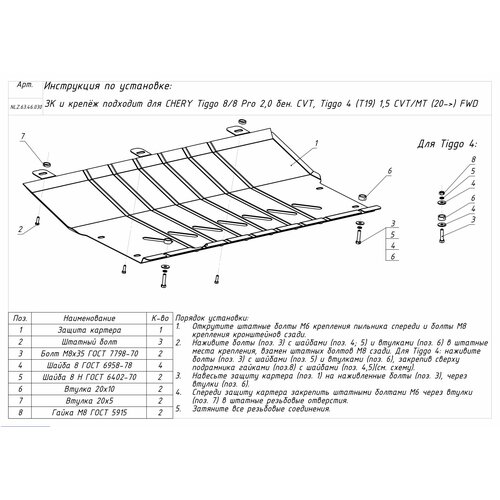 Защита картера и крепёж для CHERY Tiggo 8/8 Pro 2,0 бен. CVT, Tiggo 4 (T19)1,5 CVT/MT (20-) FWD / Черри Тигго 8 Про
