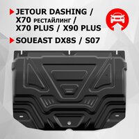 Купить Защита картера АвтоБроня для Jetour Dashing FWD ркпп 23-/X90 Plus FWD ркпп 23-/X70 FWD ркпп 23-/X70 Plus FWD ркпп 23-/Soueast DX8S FWD ркпп 22-/S07 4WD ркпп 24-, сталь 1.5 мм, с крепежом, 111.00936.1 с доставкой по всей России.