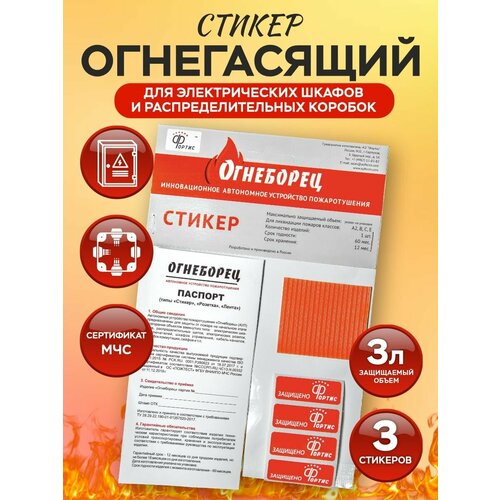 Автономное устройство пожаротушения от АО «Фортис» популярной серии "Огнеборец" - Стикер Огнегасящий 3 — это новейшая разработка в области систем пожаротушения. Ваша надежная и непрерывная защита от возгорания в объеме до 3 литров на долгие годы. Противопожарный стикер предназначен для установки в электрический щит, распределительную коробку, сейф и любое другое закрытое пространство, Огнетушащий стикер, часто называемый пиростикер, действует автономно и не требует дополнительного вмешательства.