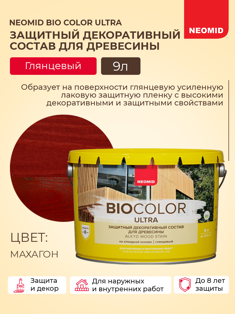 Защитная декоративная пропитка-антисептик для дерева Neomid Bio Color Ultra, махагон, 9л: сравнение цен, характеристики, фото, актуальное наличие и цены.