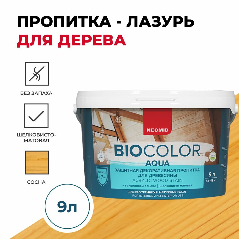 NEOMID Bio Color Aqua — деревозащитный декоративный антисептик на акриловой основе для высокоэффективной защиты и декоративной отделки деревянных поверхностей. Образует на поверхности древесины «дышащую» шелковисто-матовую защитную пленку с высокими декоративными и защитными свойствами. Лазурь экологически безопасна, не содержит растворителей. Образующееся покрытие обладает оптимальной паропроницаемостью и одновременно герметично к капельной влаге. Благодаря входящим в состав активным добавкам и воскам покрытие имеет пятиступенчатую систему защиты деревянной поверхности: