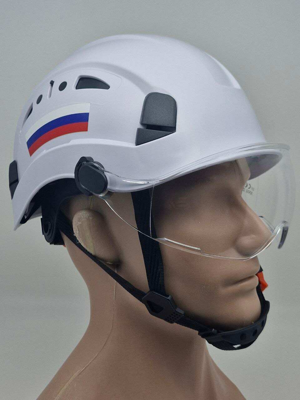 Только мы применили в конструкции шлема защитный козырёк (очки) для глаз с лёгкой тонировкой, также данный козырёк легко может убираться на верх каски.