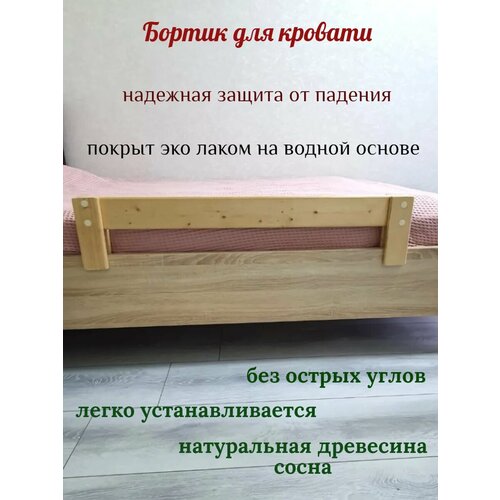 Защитный бортик для детской кровати защитит вашего ребенка от падений. Чем подвижнее ребенок, тем выше риск падения с кровати во сне. Предлагаем вашему вниманию защитный барьер для кровати, который убережет ребенка от падений, ушибов и травм. Детский бортик сделан из натуральной древесины сосны. Бортик в детскую кроватку покрыт бесцветным лаком для деревянных поверхностей, гипоаллергенен и безопасен для малышей. Не требует закрепления с помощью шурупов, тем самым не повредит вашу кровать. В комплекте отвертка не предусмотрена. Надежно садится на край кровати. Не требует дополнительного сверления кровати, легко устанавливается и снимается при необходимости. Главная задача ограничителя для кровати – это безопасность ребенка.