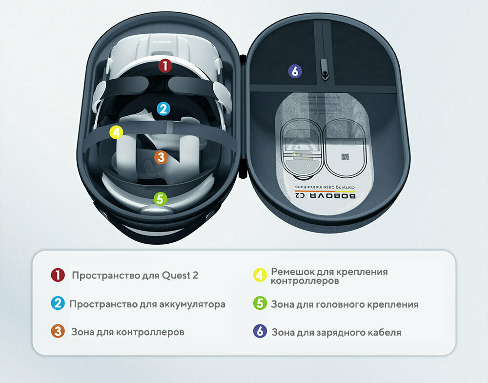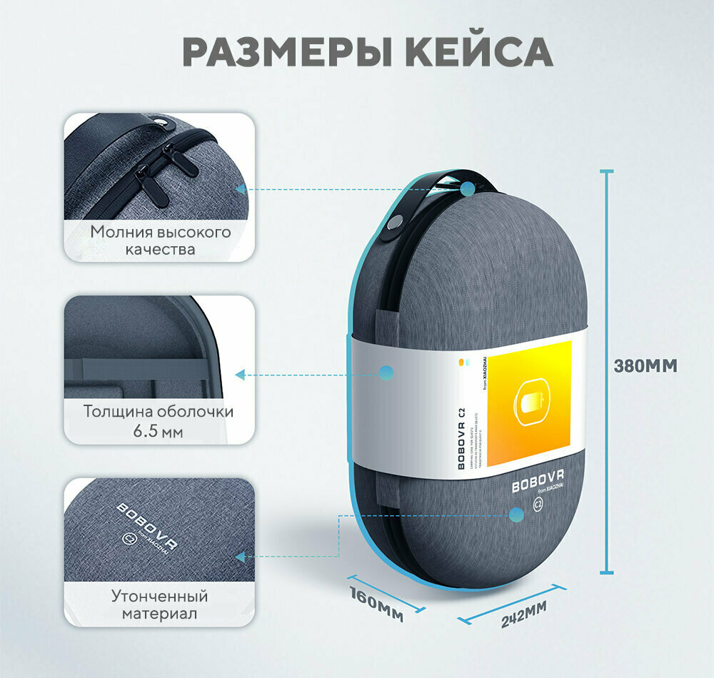 BOBOVR C2 сумка для хранения подходит для всех в одном VR не подходит для HTC Vive Das ремень Особенности: 1. Чехол BOBOVR C2 специально разработан для Quest2 и BOBOVR M2 имеет высокую совместимость и большое пространство для хранения 2. Совместим со всеми все-в-одном Очки виртуальной реальности VR очки (за исключением htc vive серии, htc vive гарнитура слишком велик для Очки виртуальной реальности BOBOVR C2 чехол) 3. Совместим с официальными элитными повязками на голову и различными типами ремешков (кроме ремешков DAS). Если высота повязки составляет менее 15 см (6 дюймов), вы можете поместить ее. 4. 6,5 мм Толстая подложка из вспененного каучука материал, с галечная форма, которая устойчива к падению, удара, защита от пыли и брызг и лучше защищает ваши Quest2 5. Внутренний чехол достаточно разделен на несколько областей, которые могут вместить хост Quest2 и контроллер, Оснащенный большим ремешком на голову, и оснащен сумкой для хранения, который может быть загружен в кабель для передачи данных/зарядную головку и т. д. 6. Размеры: 380 мм X 242 мм X 160 мм/15 х 9,5 х 6,3 В
