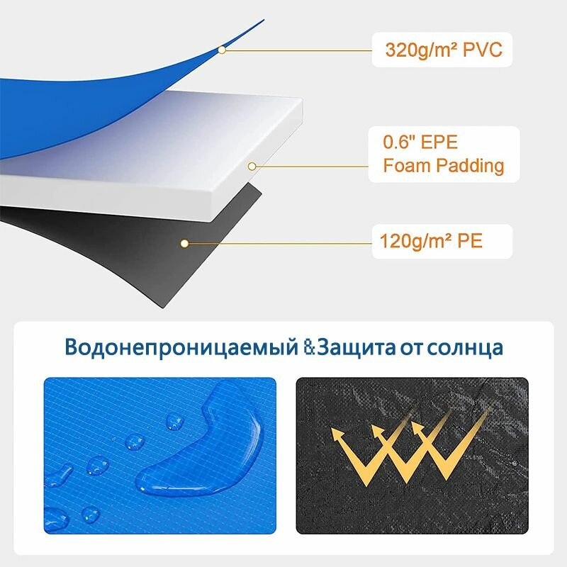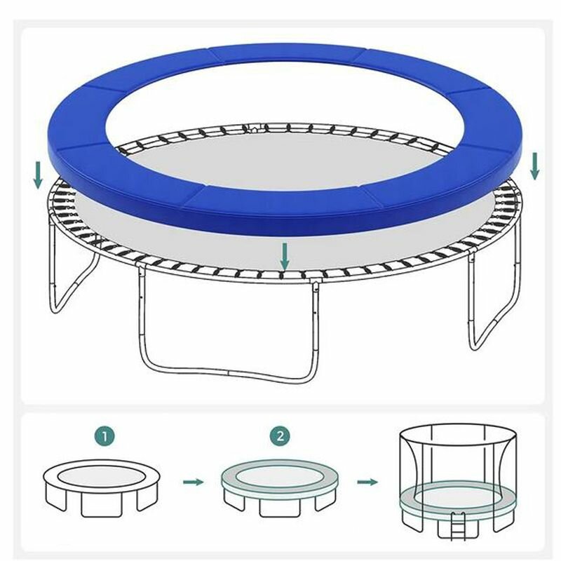 1. только защитная подушка - Это только круглая синяя защитная подушка. В комплекте двойные резиновые стяжки для лучшей защиты и плотного крепления к раме батута и коврик для прыжков. 2. измерение - Ваша рама должна быть круглой с диаметром 14 футов. 3. дополнительные характеристики - Это высококачественная, амортизирующая, устойчивая к разрывам подушка из пеноматериала с закрытыми порами, которая не впитывает воду, плесень и не теряет форму. Покрытие к ультрафиолетовому излучению и холодным погодным условиям.