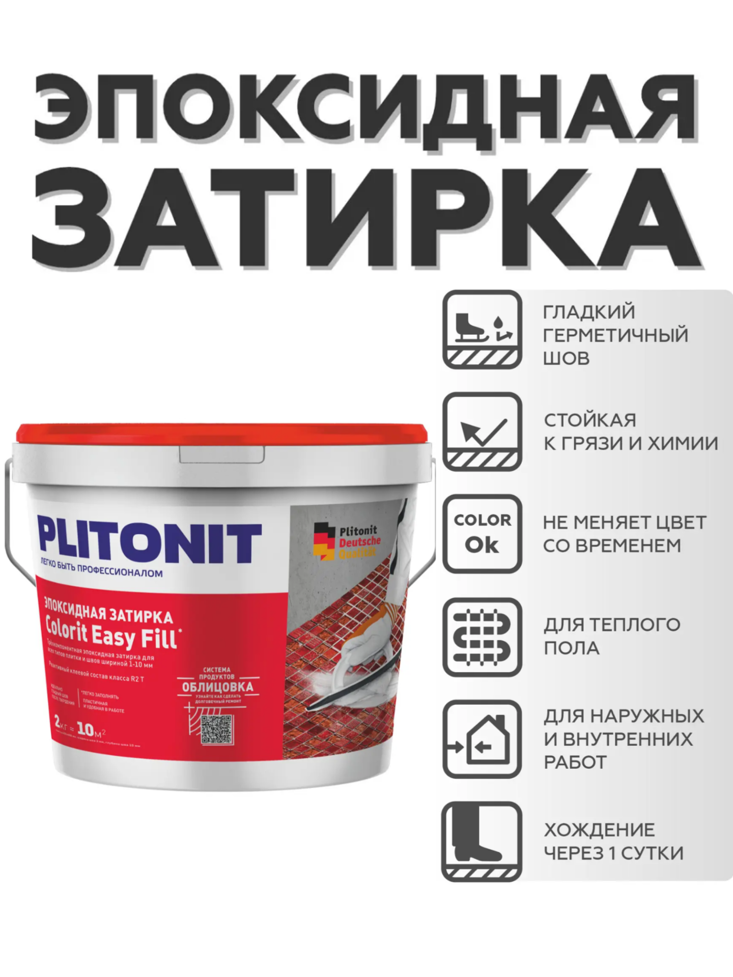 Трёхкомпонентная эпоксидная затирка/реактивный клеевой состав, применяется для проведения наружных и внутренних работ при строительстве, ремонте и реконструкции зданий и сооружений, в том числе складов, цехов промышленных предприятий, жилых и общественных зданий, бассейнов и прочих спортивных сооружений, учебно-воспитательных учреждений (в т. ч. лечебно-профилактических и санаторнокурортных).