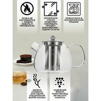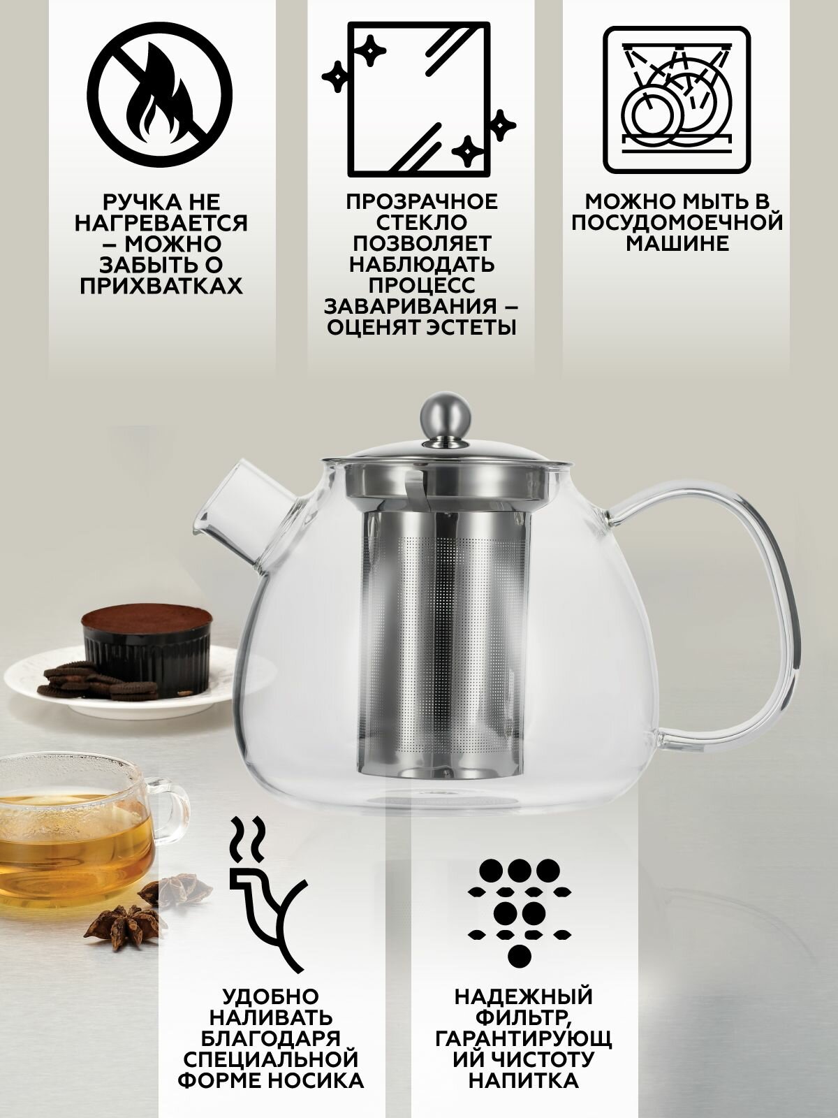 Чайник выполнен из жаропрочного боросиликатного стекла, что обеспечивает его долговечность и безопасность при использовании. Объем чайника составляет 1000 мл, что позволяет приготовить достаточное количество напитка для большой компании.