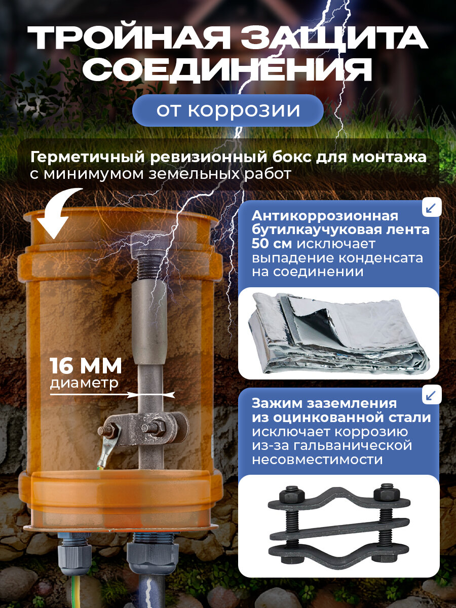 Комплект заземления для дома из оцинкованной стали диаметром 16 мм и длиной 3 метра — надежное решение для вашего дома. Этот комплект предназначен для создания эффективной системы заземления, что является ключевым элементом в защите человека от поражения электрическим током, статическим током, а так же снижает взрывоопасность газового оборудования.
