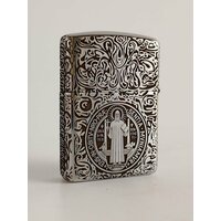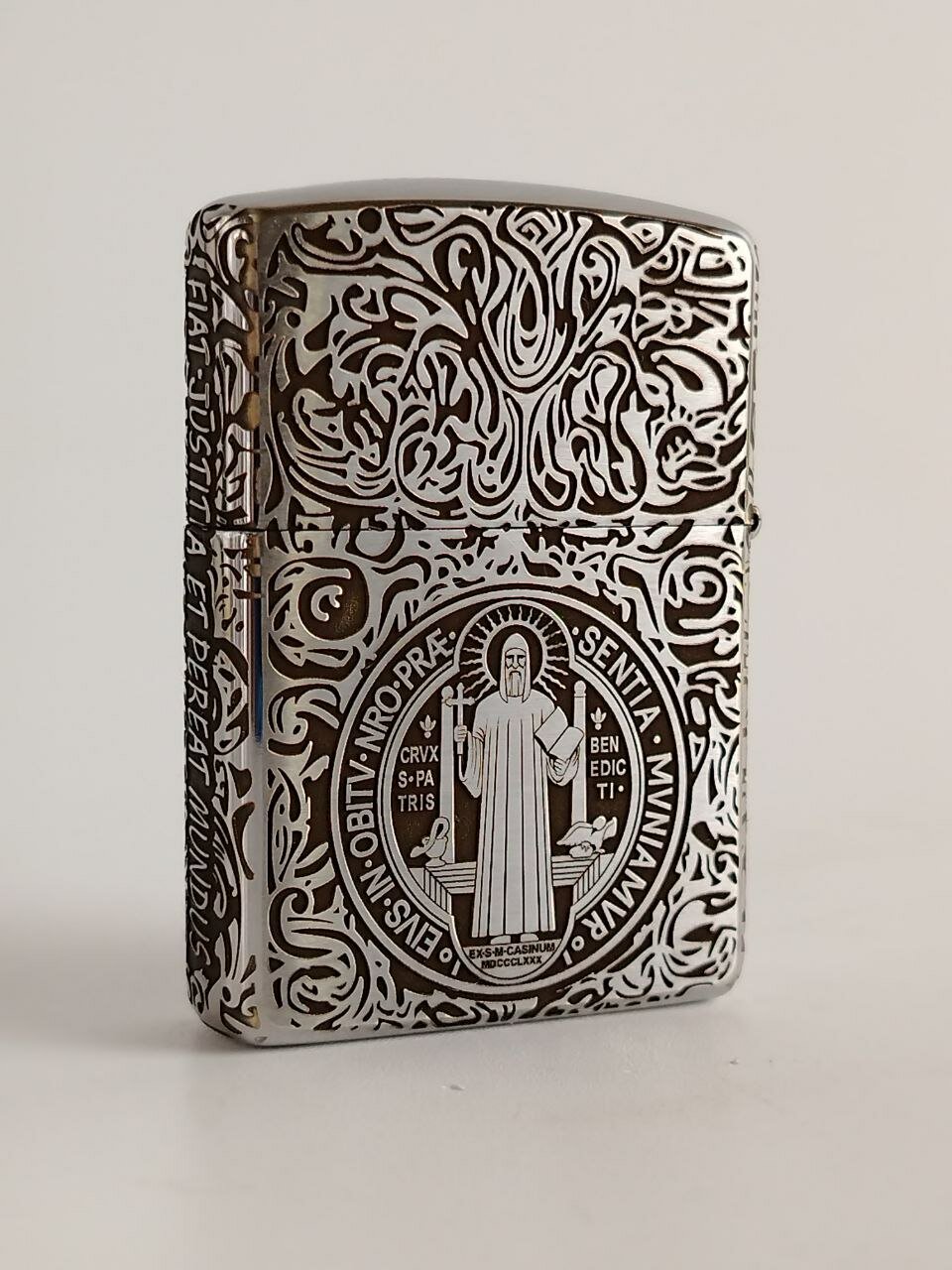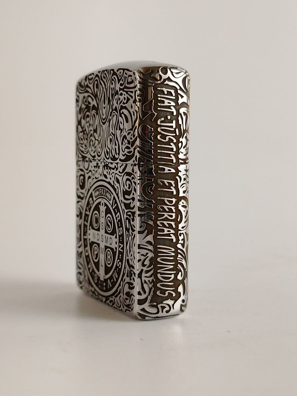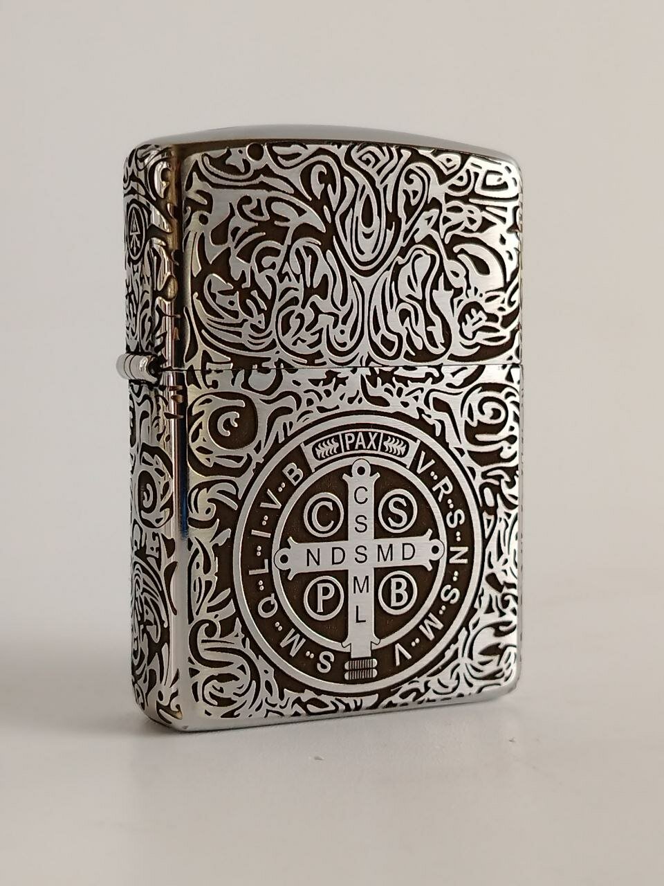 На зажигалке изображена точная копия медальона святого Бенедикта, на котором располагаются следующие аббревиатуры: