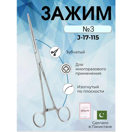 Зажим кровоостанавливающий зубчатый изогнутый N 3 длиной 270 мм представляет собой медицинский инструмент, предназначенный для эффективной остановки кровотечений во время хирургических вмешательств. Изогнутая форма зажима обеспечивает удобство в работе, позволяя врачу точно контролировать сжатие тканей.
