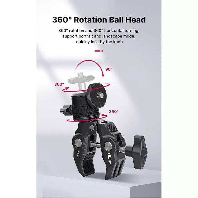 Зажим изготовлен из алюминия и прочного АБС пластика. Для установки аксессуаров предусмотрен винт 1/4. Место крепления оснащено прорезиненной прокладкой, исключающей появление потертостей и царапин на корпусе устройств. Противоскользящее крепление облегчает процесс установки оборудования