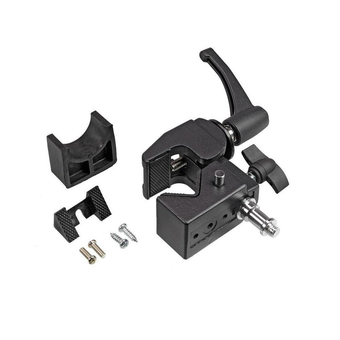 Зажим изготовлен из металла, вес 0,41 кг. В комплекте переходник 5/8" с резьбой 1/4" и 3/8", адаптер для установки зажима на плоскую поверхность, резиновый упор.