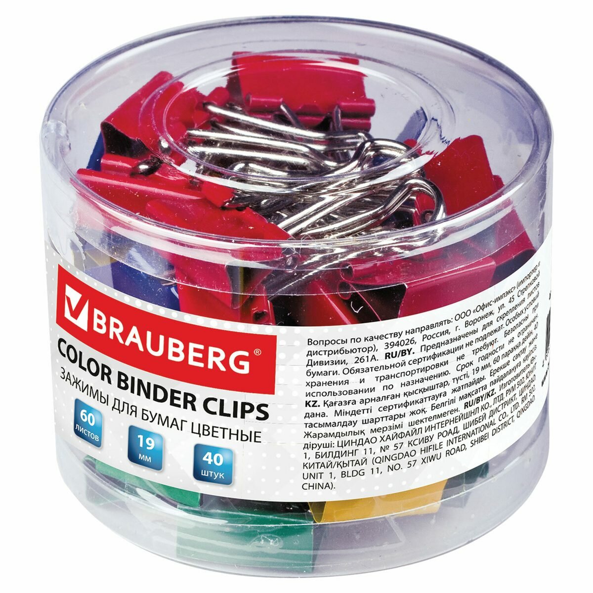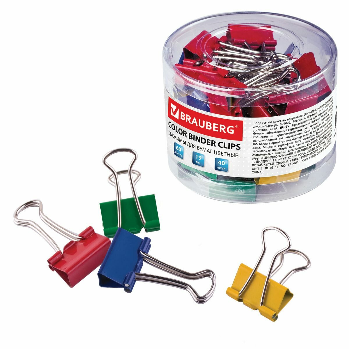 Зажимы для бумаг металлические Brauberg (19мм, до 60 листов, цветные) в пластиковом цилиндре, 40шт. (221127), 96 уп.: сравнение цен, характеристики, фото, актуальное наличие и цены.
