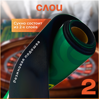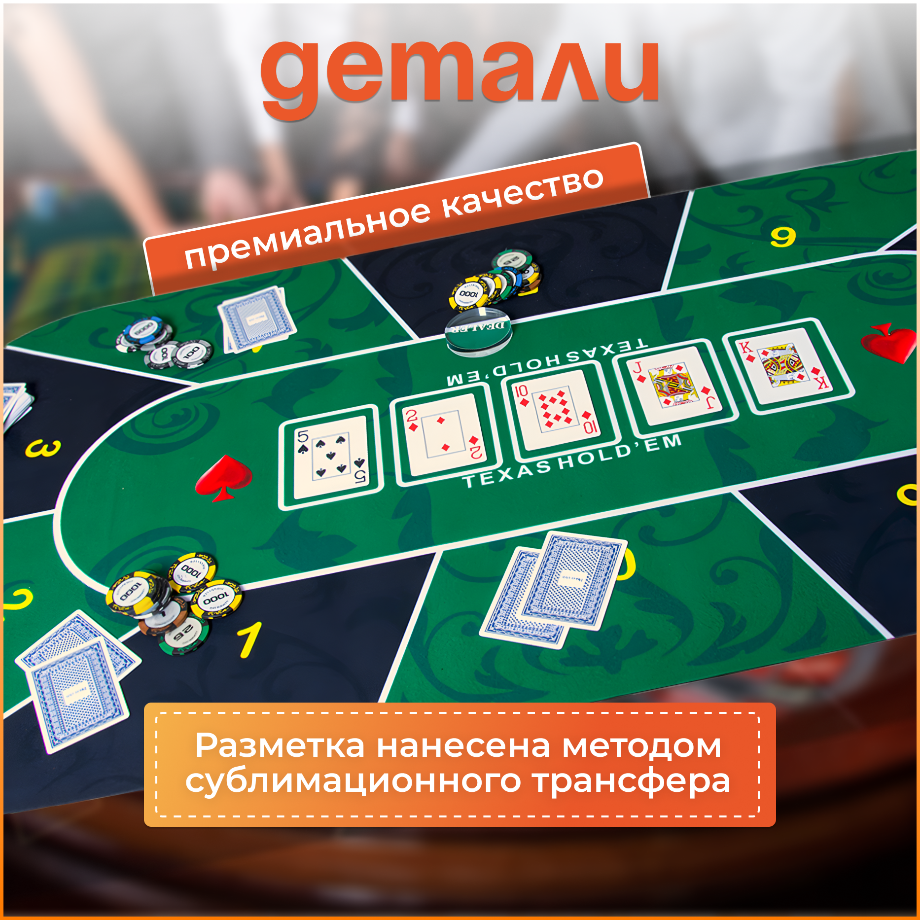 Сукно имеет насыщенный зеленый цвет, который создает атмосферу профессионального покерного стола. Специальное покрытие обеспечивает удобство раздачи карт, предотвращая их стирание, погнутость и загрязнение.