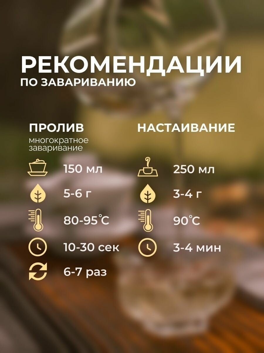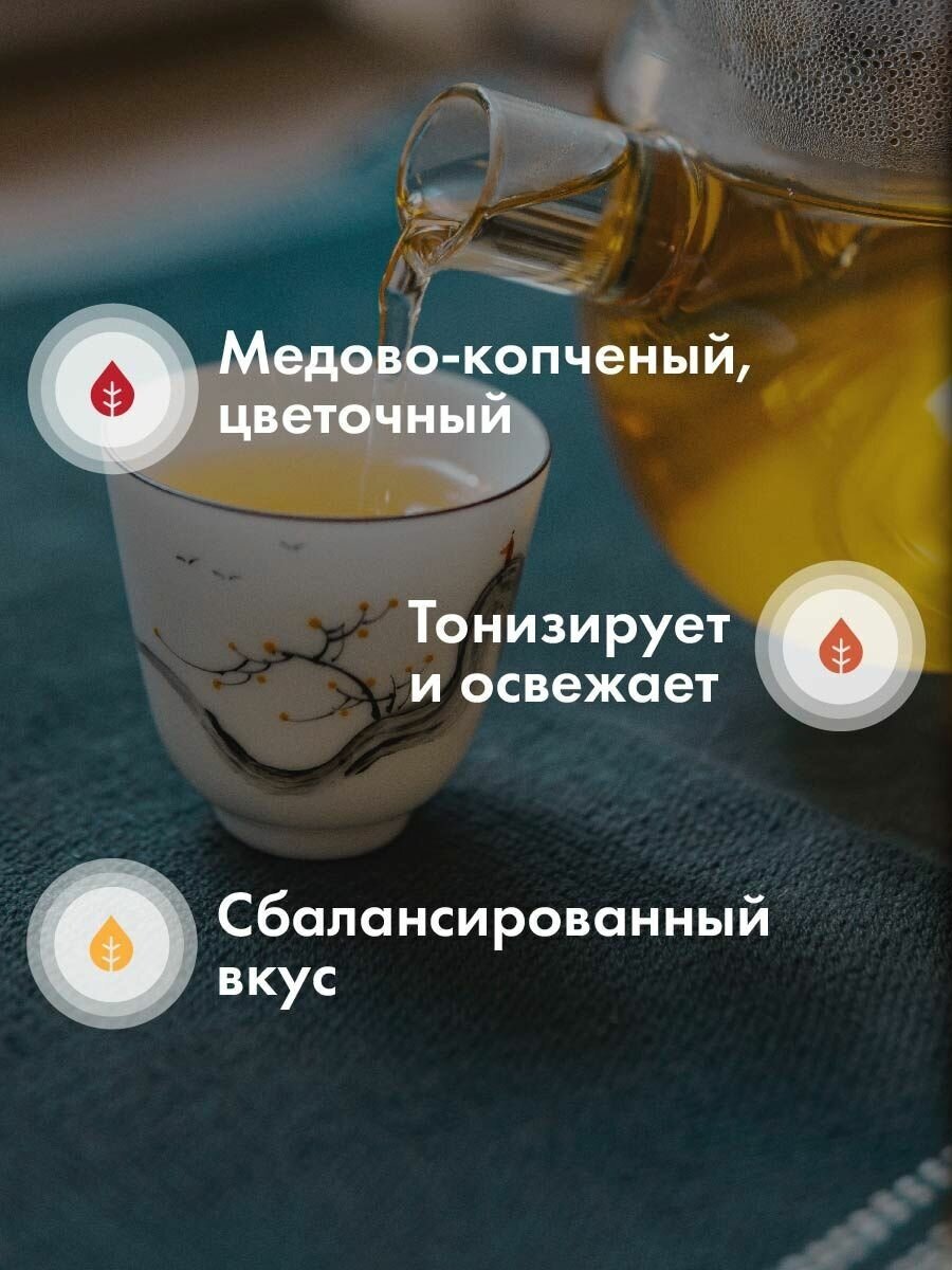 Этот уникальный листовой вид чая, произведенный в Китае, имеет необычный аромат. Вкус мягкий, свежий, сладкий, сухофруктовый, с нотками цветов, чернослива и кураги. Очень приятное, объёмное послевкусие, тёплое и уютное. Чайная церемония лучше всего раскроет красивый профиль этого сорта.