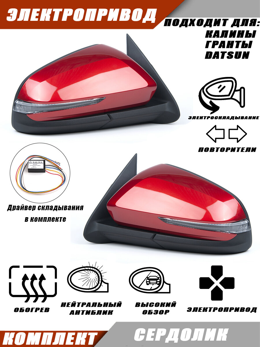 Комплект боковых зеркал заднего вида с электроскладыванием (драйвер складывания в комплекте), обогревом и повторителем поворота, для автомобилей Гранта и Калина. Зеркала изготовлены в корпусе Vesta 2181, Solina.