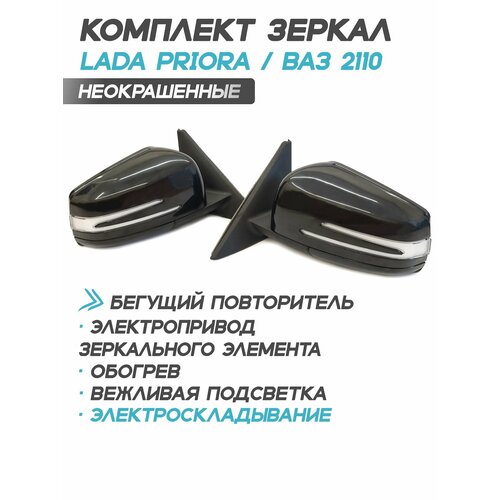 Комплект боковых зеркал Лада Приора стиль Mercedes Benz c двойным бегущим повторителем Повторитель поворота работает в динамическом режиме (бегает) Вежливая подсветка: Да Электроскладывание: Да Регулировка зеркального элемента: Электропривод Обогрев зеркального элемента: Да Цвет: Неокрашенные