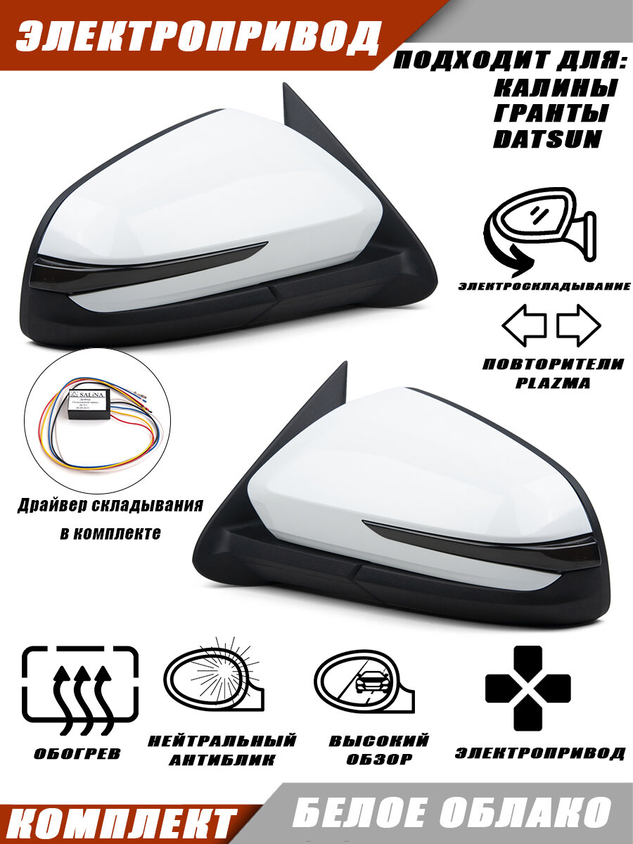Комплект боковых зеркал заднего вида с электроскладыванием (драйвер складывания в комплекте), обогревом и повторителем поворота Plazma, для автомобилей Гранта и Калина. Зеркала изготовлены в корпусе Vesta 2181, Solina.