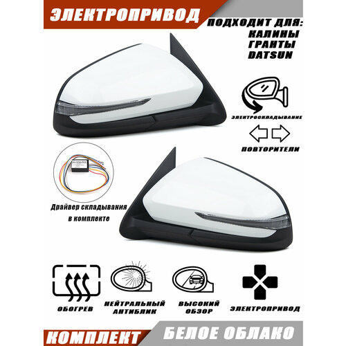 Комплект боковых зеркал заднего вида с электроскладыванием (драйвер складывания в комплекте), обогревом и повторителем поворота, для автомобилей Гранта и Калина. Зеркала изготовлены в корпусе Vesta 2181, Solina.