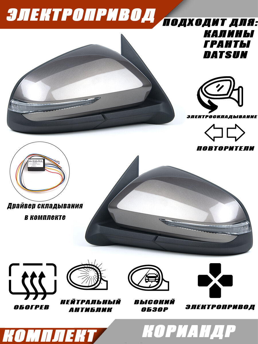 Комплект боковых зеркал заднего вида с электроскладыванием (драйвер складывания в комплекте), обогревом и повторителем поворота, для автомобилей Гранта и Калина. Зеркала изготовлены в корпусе Vesta 2181, Solina.
